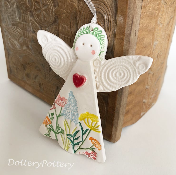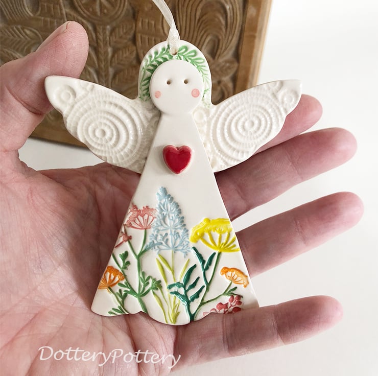 This cute little angel is made from white earthenware clay and decorated with coloured flowers. It has been finished with a clear, glossy glaze. Fired twice. Glazed on the front only. It measures 8.5 cm high and 7 cm wide and hangs from a cream organza ribbon.
