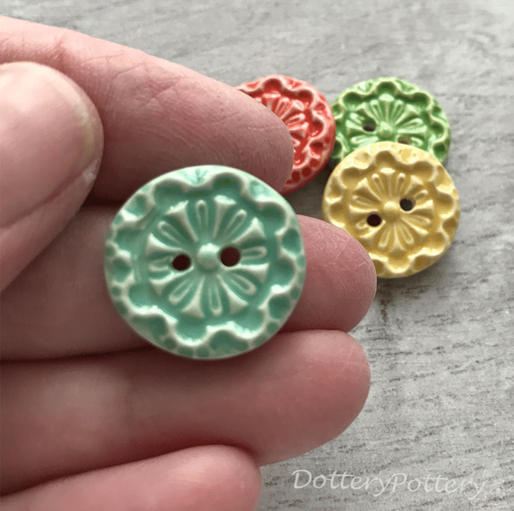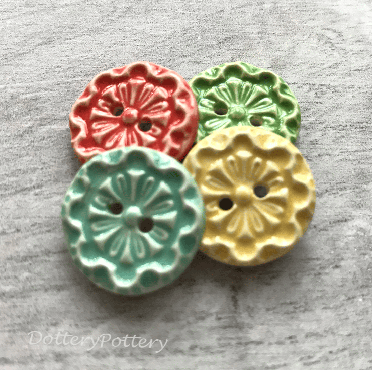 This set of four pottery buttons are made from white earthenware clay, embossed and glazed on the front. They are then fired to 1100 degrees, so nice and strong. They measure 1.8cm across. They can be handwashed or machine washed on a low temperature. Perfect for all sorts of arts and craft projects