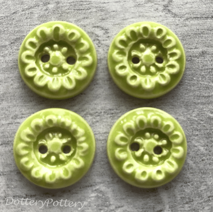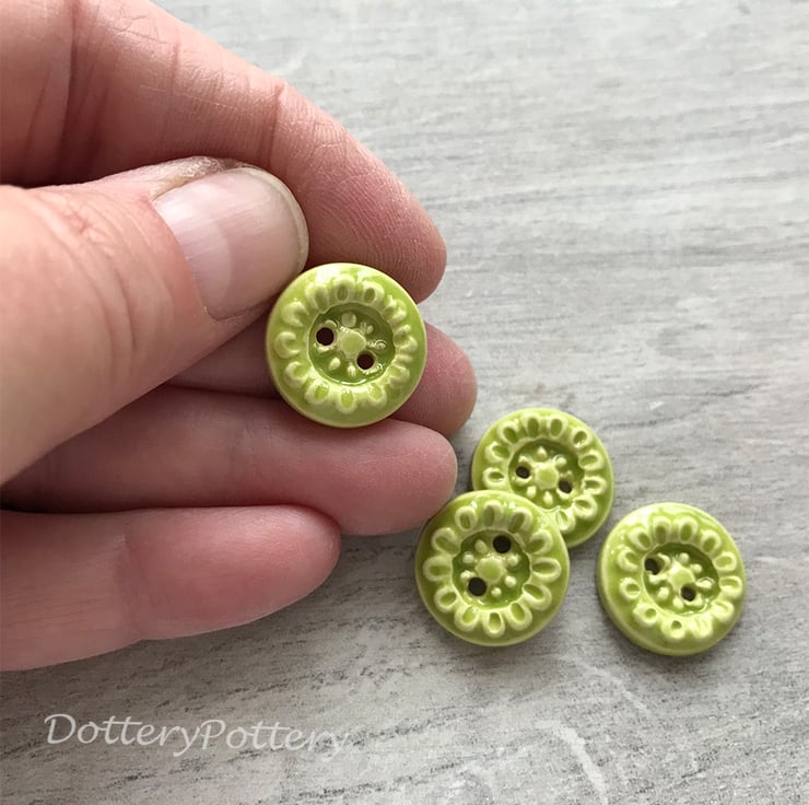 This set of four pottery buttons are made from white earthenware clay, embossed and glazed on the front. They are then fired to 1100 degrees, so nice and strong. They measure 1.6cm across. They can be handwashed or machine washed on a low temperature. Perfect for all sorts of arts and craft projects