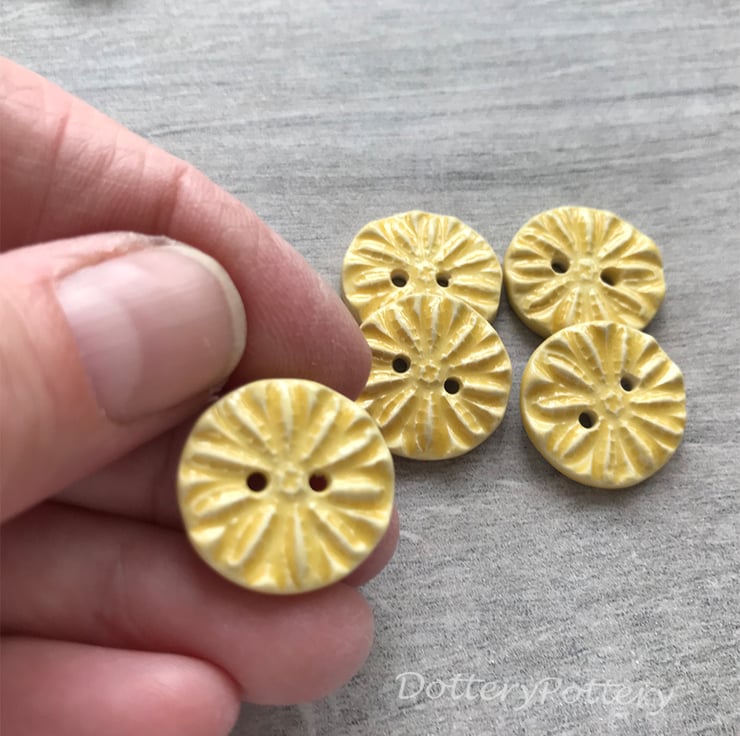 This set of five pottery buttons are made from white earthenware clay, embossed and glazed on the front. They are then fired to 1100 degrees, so nice and strong. They measure 1.8cm across. They can be handwashed or machine washed on a low temperature. Perfect for all sorts of arts and craft projects
