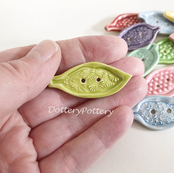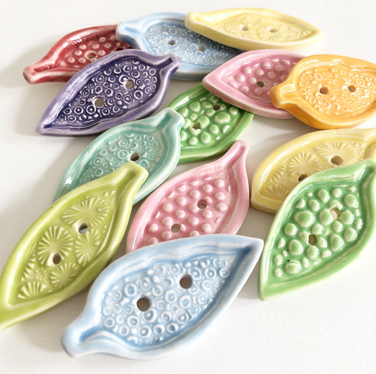 This set of pottery leaf shaped buttons are made from white earthenware clay, embossed and glazed on the front. They are then fired to 1100 degrees, so nice and strong. They measure 4cm long x 2cm wide and 0.4cm deep. They can be handwashed or machine washed on a low temperature. Perfect for all sorts of arts and craft projects