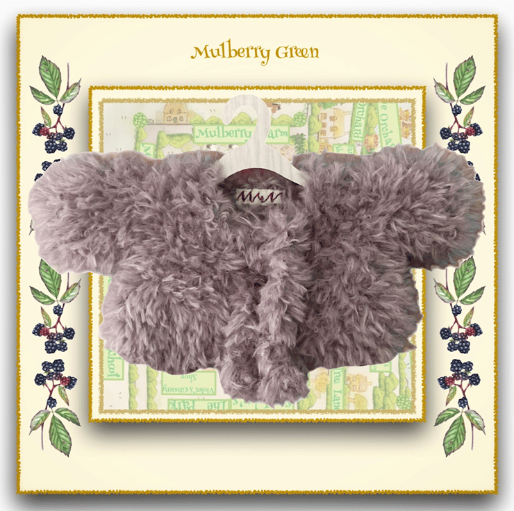 A cute little light brown faux fur shrug, to fit the Mulberry Green characters. The shrug is hand knitted and fastens with a tie at the front. It looks lovely with the dresses.