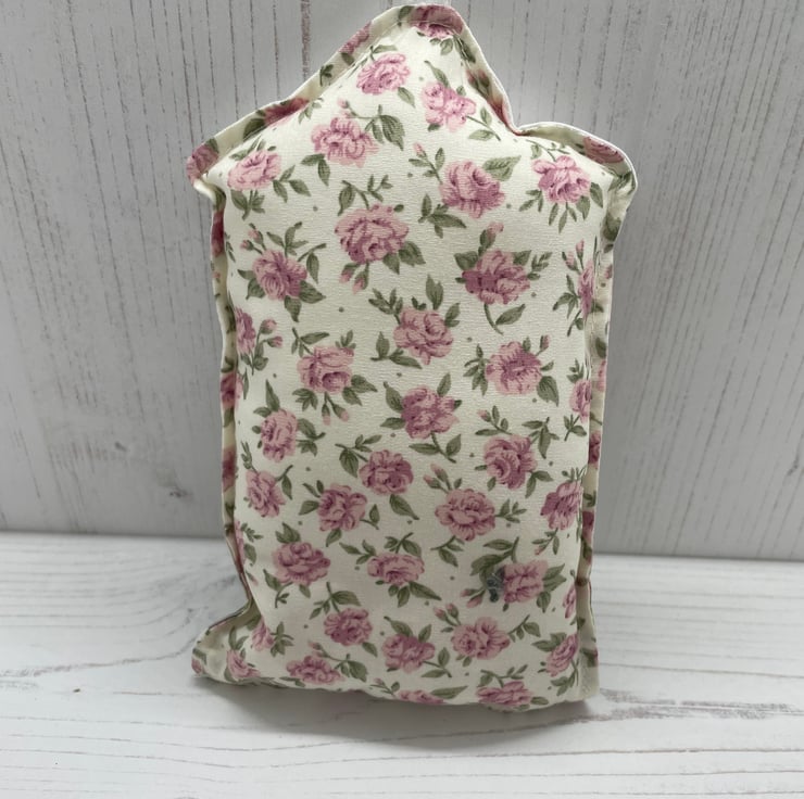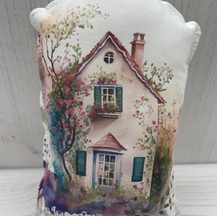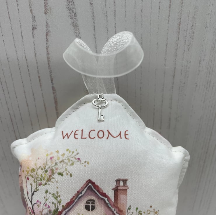 Pretty quintessential English country cottage printed onto cotton fabric, backed with a vintage Rose & Hubble rosebud printed cotton. Ivory organza ribbon for hanging and a silver tone key charm to embellish. Filled with polyesters fibrefill. This is perfect to hang from a door handle in your hallway or a guest room to Welcome your guests, also a New Home gift.