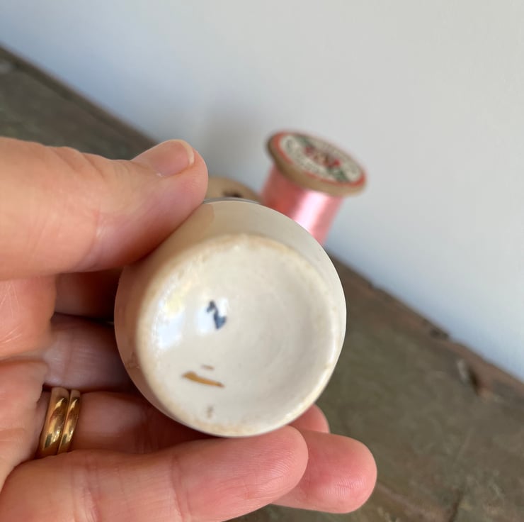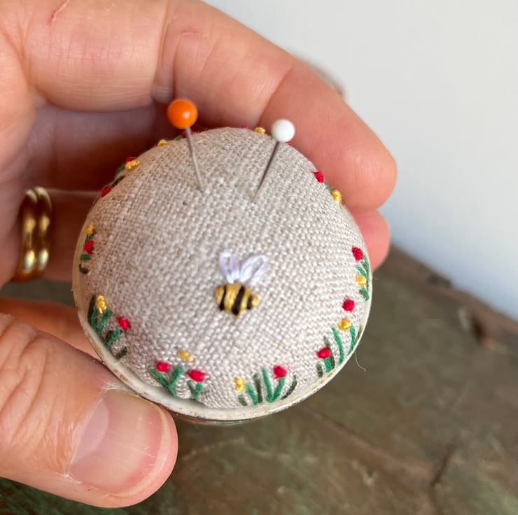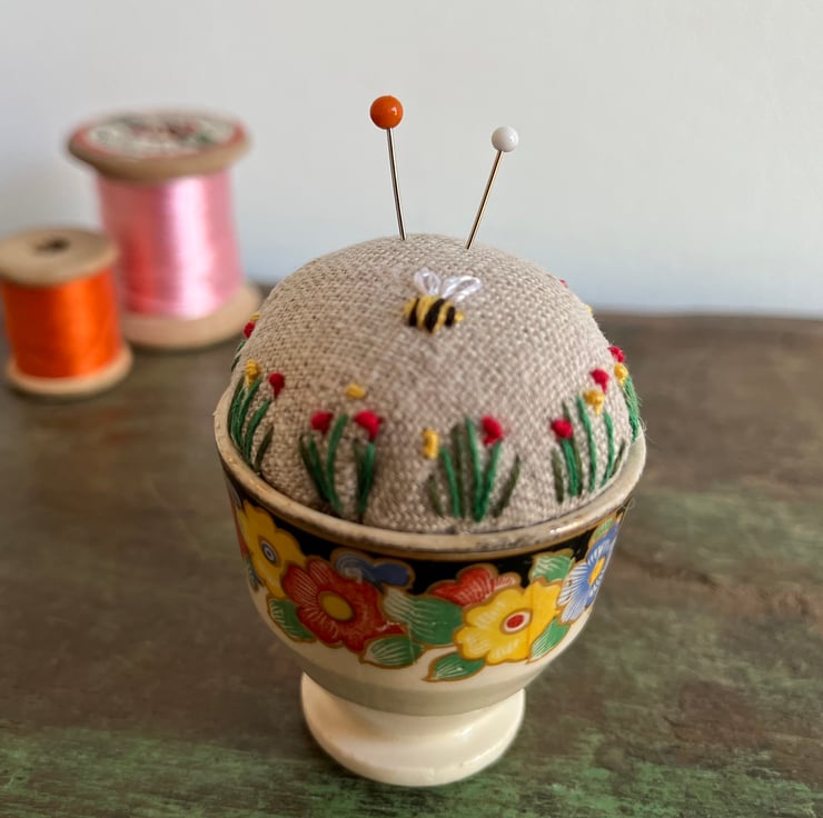 Cute embroidered pincushion in a vintage floral egg cup. This pretty little egg cup has a few small chips and nibbles and a little wear to the surface decoration so it was perfect for repurposing. The reclaimed linen cushion has been embroidered with tiny flowers and a bee.