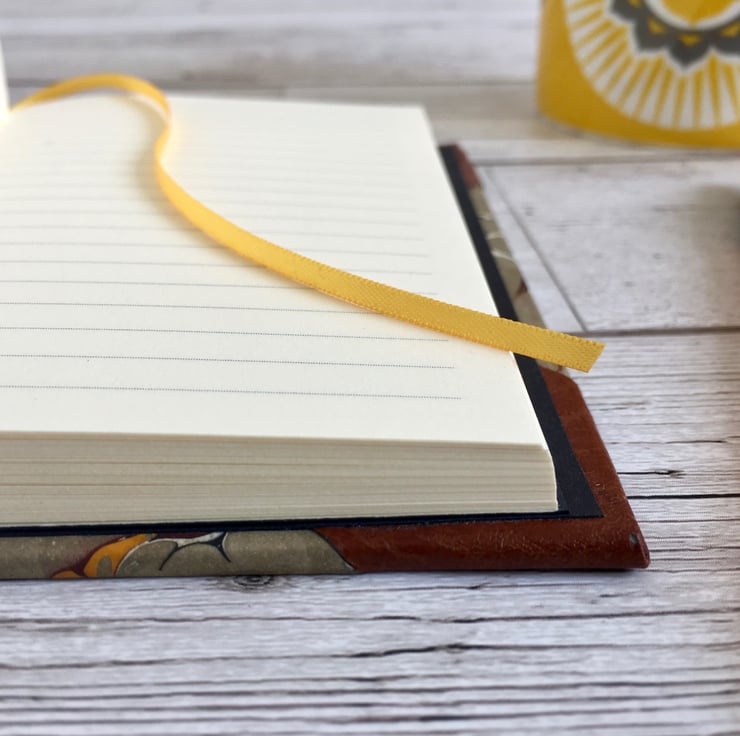 Covered with handpainted marble paper with leather paper spine & corners in A6 size.