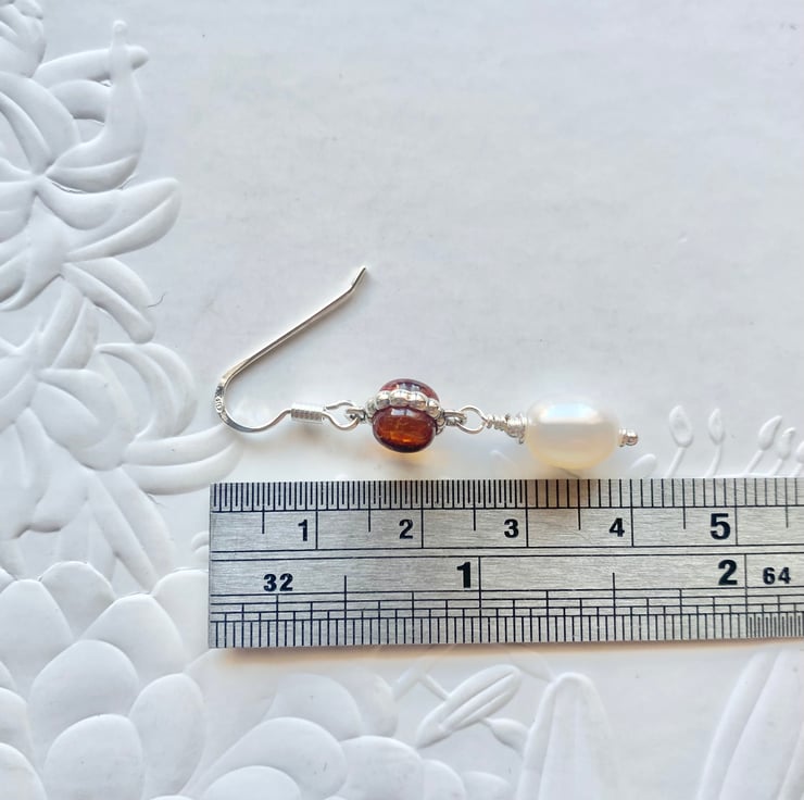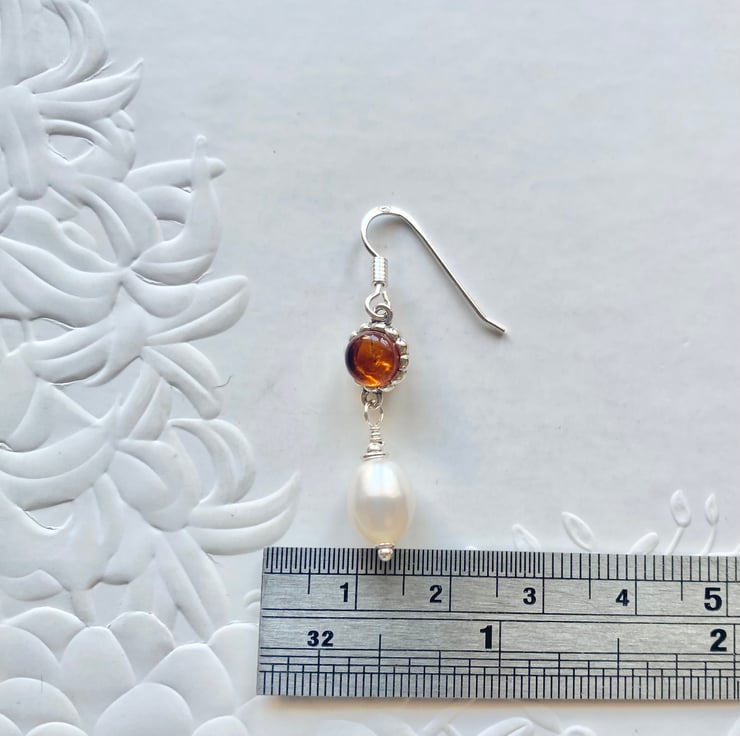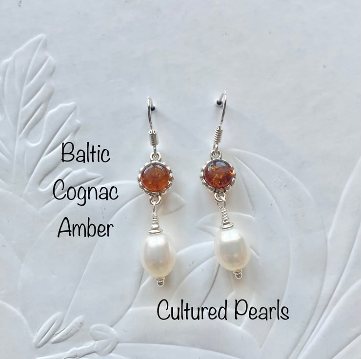 Beautiful handmade earrings featuring sterling silver bezel set Baltic Cognac Amber rounds, white freshwater cultured Pearls and sterling silver shepherds hooks. Very elegant earrings that are easy to wear.