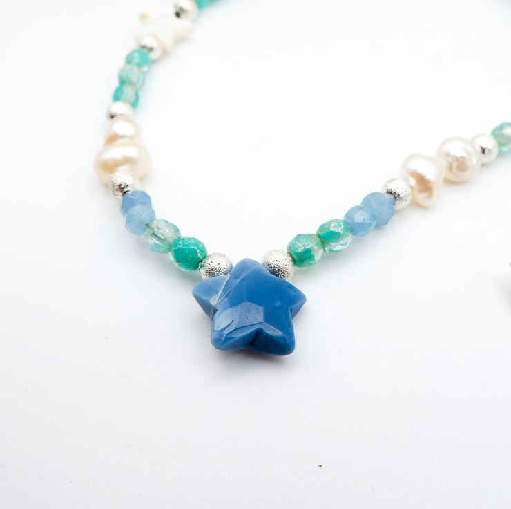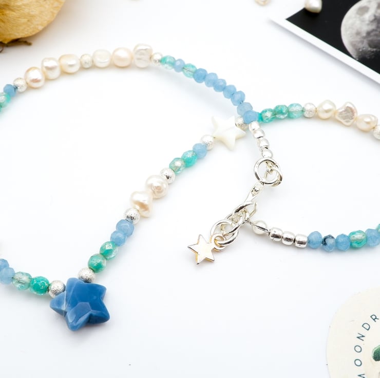 Introducing the Celestial Freshwater Pearl Blue Opal Star Charm Gemstone Beaded Necklace, a creation that draws inspiration from the cosmos itself, handmade by Moondrop Studio!