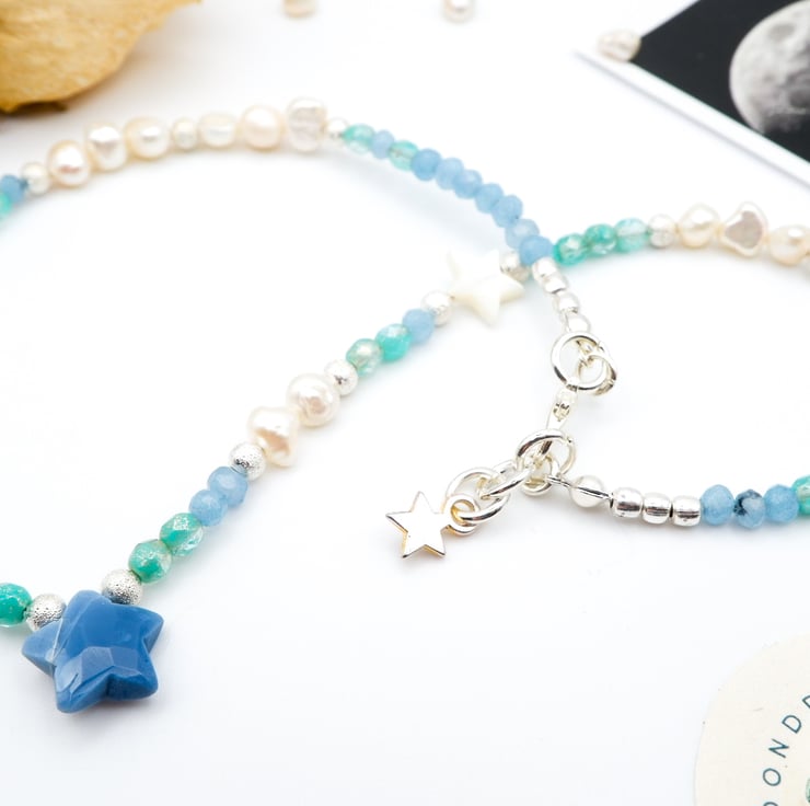 Our Celestial Freshwater Pearl Blue Opal Star Charm Gemstone Beaded Necklace draws inspiration from the beauty of the celestial sky.