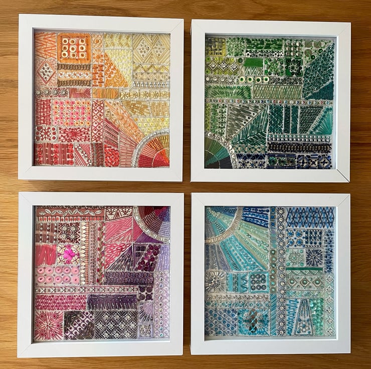 Detailed hand embroidered piece of textile art made with colourful thread, beads, trimming and sequins - an ombre decorative pattern of Pale Blue, Aqua, Bright blue.