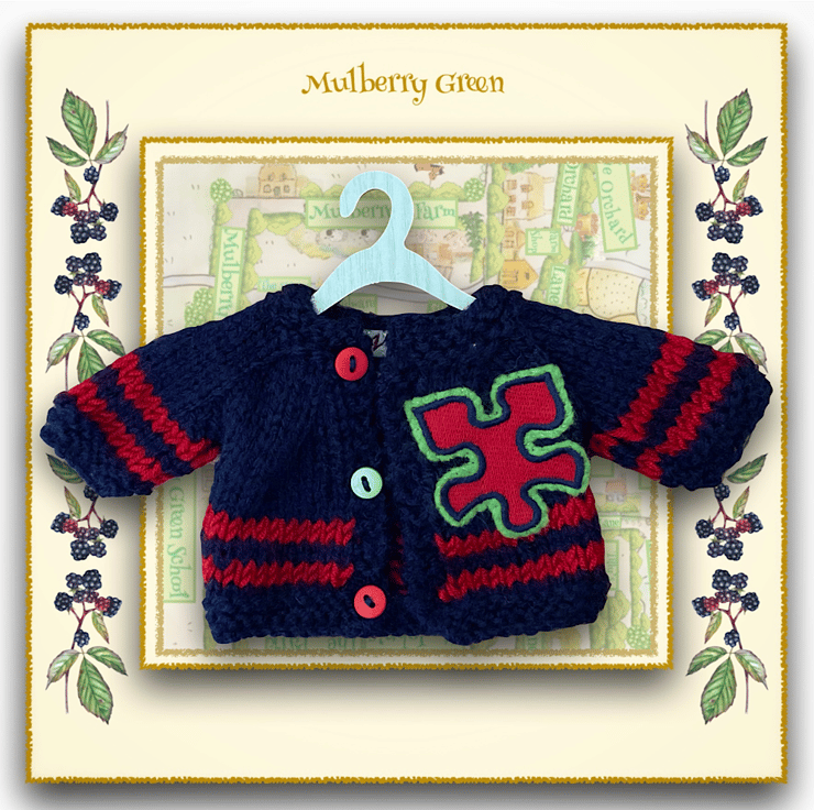 A lovely little navy cardigan, embroidered with a jigsaw piece, to fit the Mulberry Green characters. The cardigan is hand knitted and is finished with 3 bright buttons.