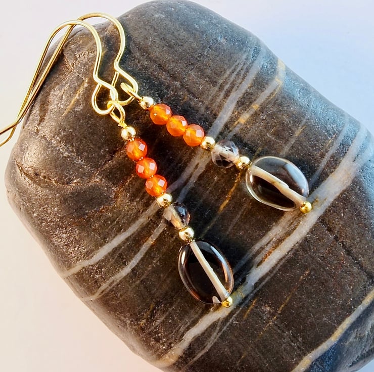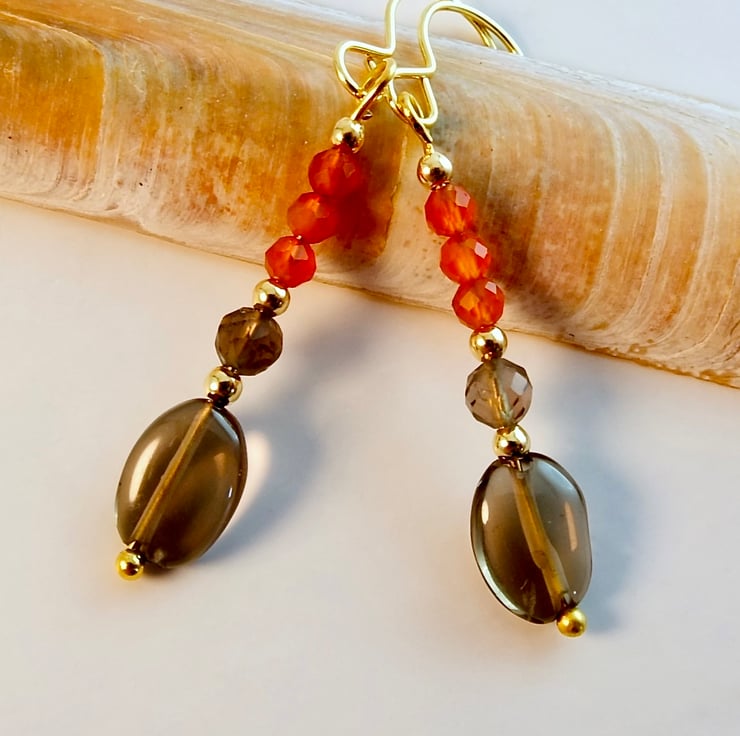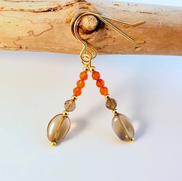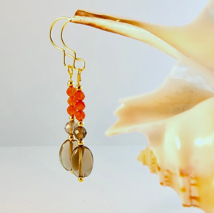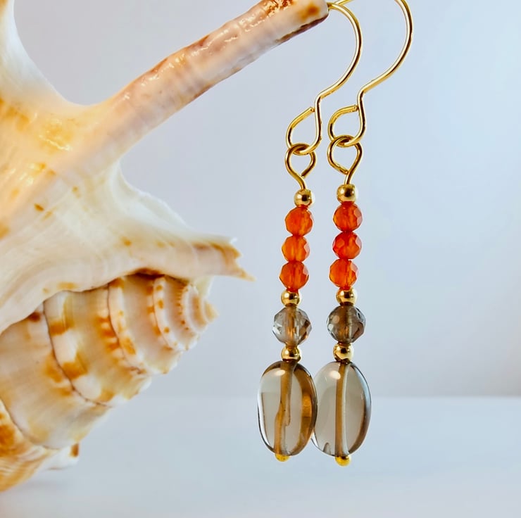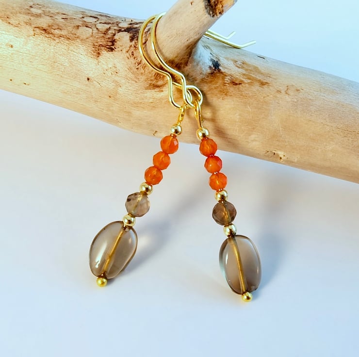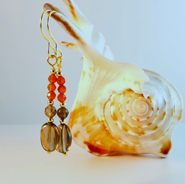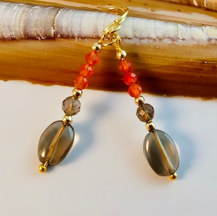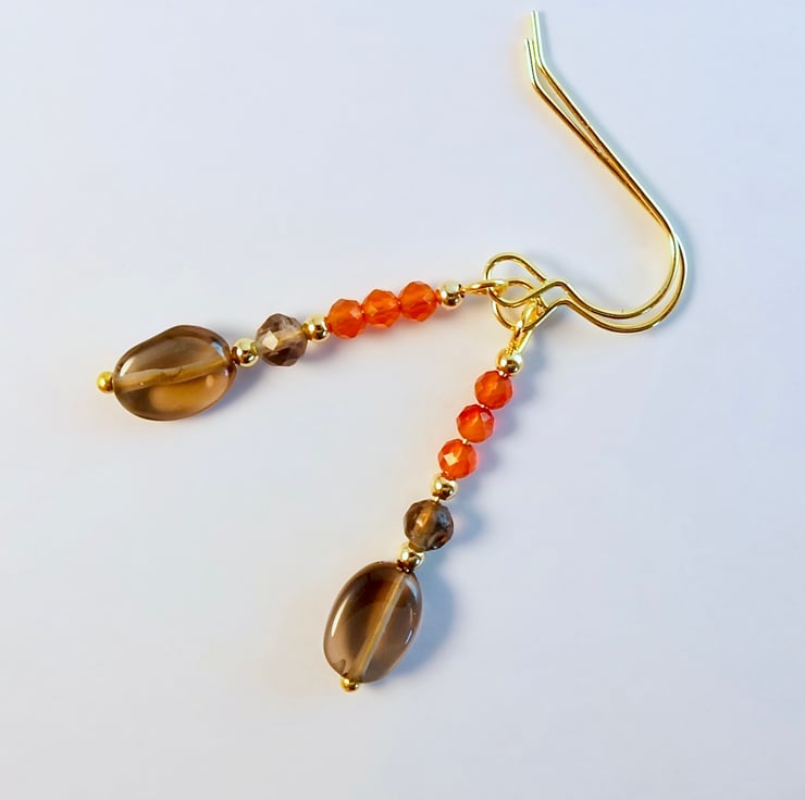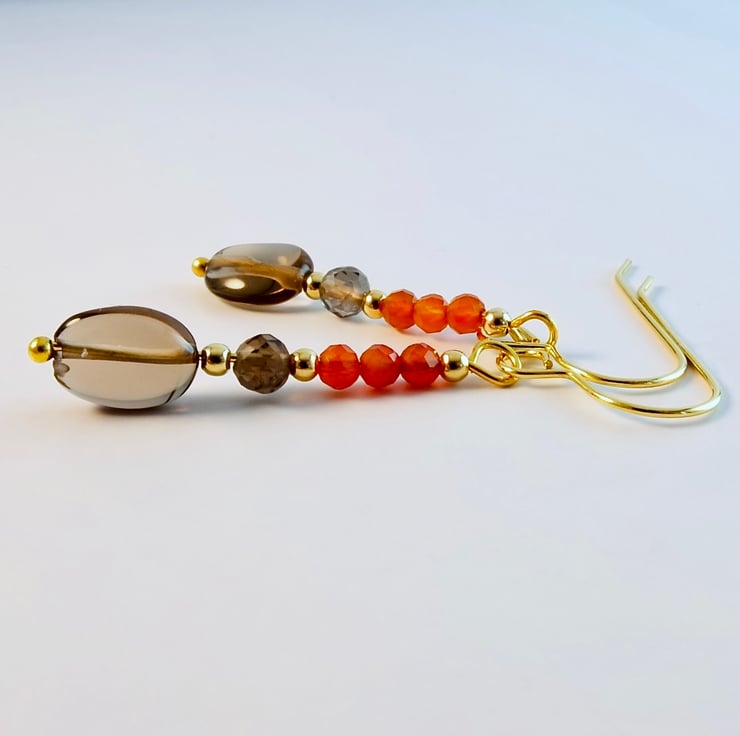 Each of these dainty earrings features a 8-9mm Smokey Quartz oval nugget and 3.5mm faceted Smokey Quartz round bead, topped with a trio of 2.75, AAA grade, micro-faceted Carnelian beads.