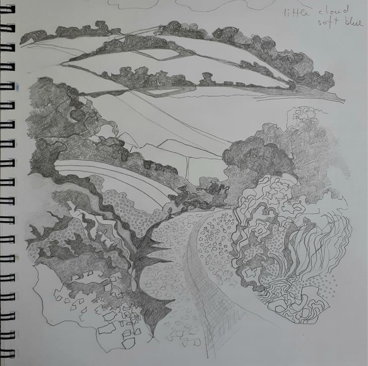This is the view I see every day as I walk my dog over the hill where I live. I often take a sketchbook later on without the dog, as she`s pretty lively & I need to concentrate when I`m drawing! I particularly like to add a track, road or pathway to the design as it leads the eye into the drawing & gives a focus. I like to imagine where the path is going to lead me, over the hills and out of sight.