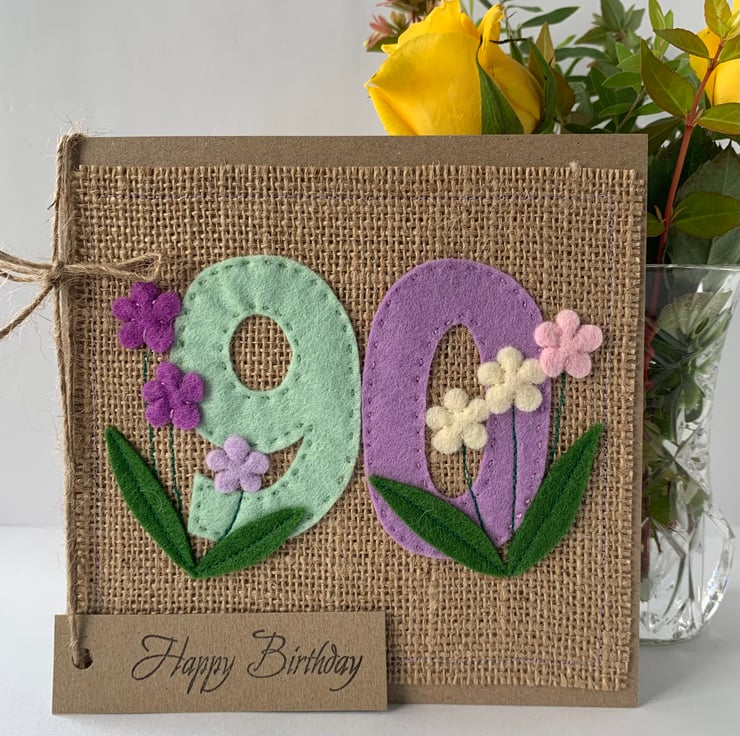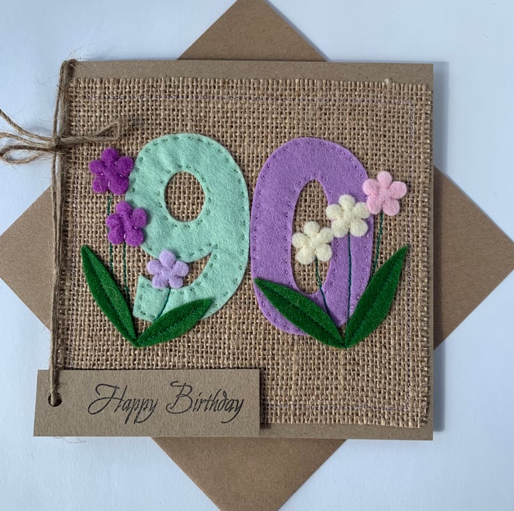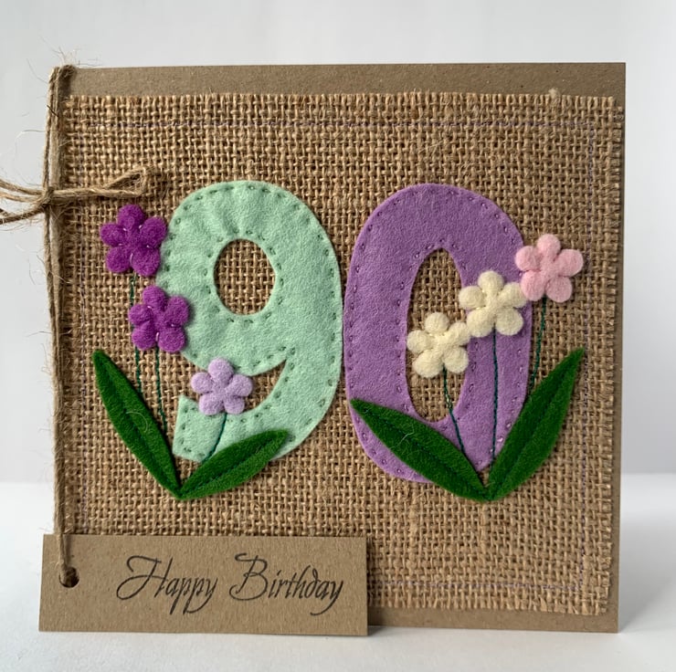 A unique handmade card for a special birthday. The numbers for this 90th birthday are hand cut from lilac and mint green acrylic felt and hand sewn to a hessian background. Flowers, hand cut from wool felt, in pale pink, lilac, purple and cream are added to decorate the card.
