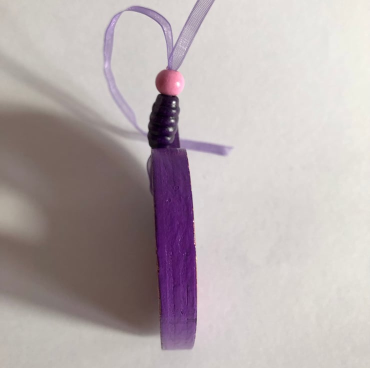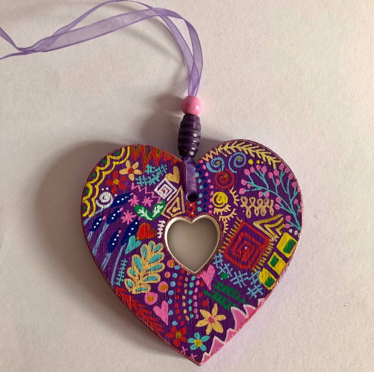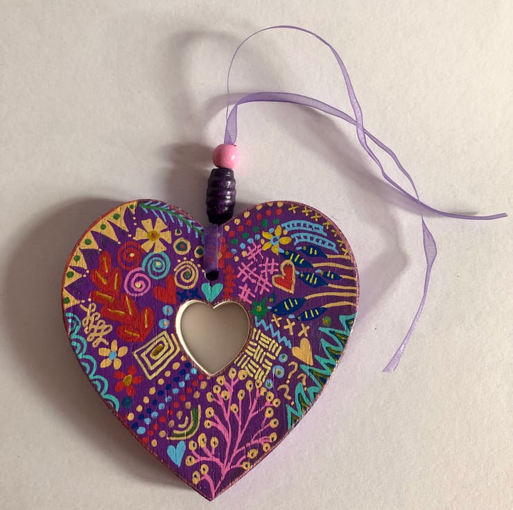 Both sides and edge of this wooden heart have been painted purple with the addition of random colourful doodles