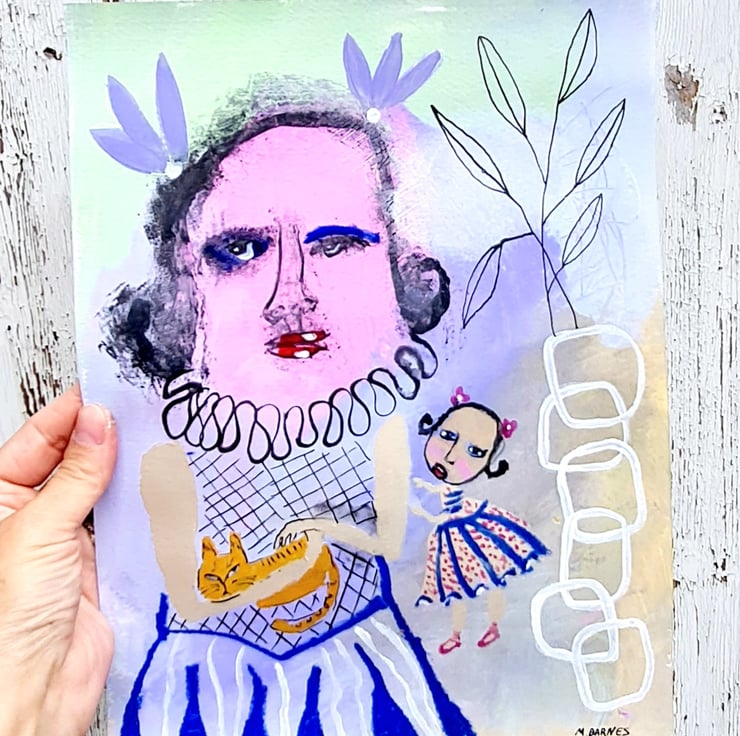 "Surreal Folk Art: A Colorful Mixed Media Painting of Mother, Daughter, and Ginger Cat"