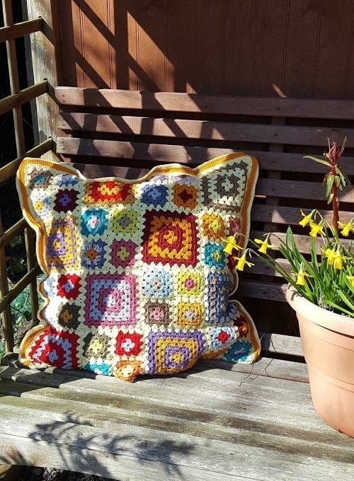 Bring brightness to an uninspiring corner of your home with this bright sunny cushion. The cushion would be perfect for your garden chairs in the summer or a conservatory. This finished cushion has a patchwork effect which is created by using one solid colour for the last row of the squares. It is deceptively simple to make.