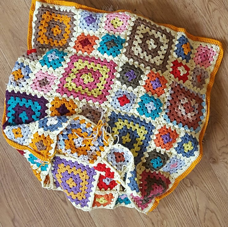 The design is a perfect yarn scraps project, made in double knit yarn and as you can see from the images it looks very different depending on the colours you choose. You will need one main colour to bring the design together.