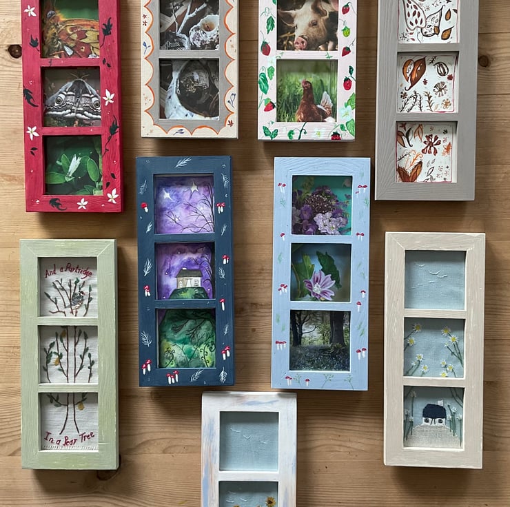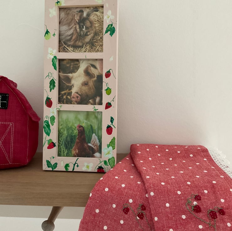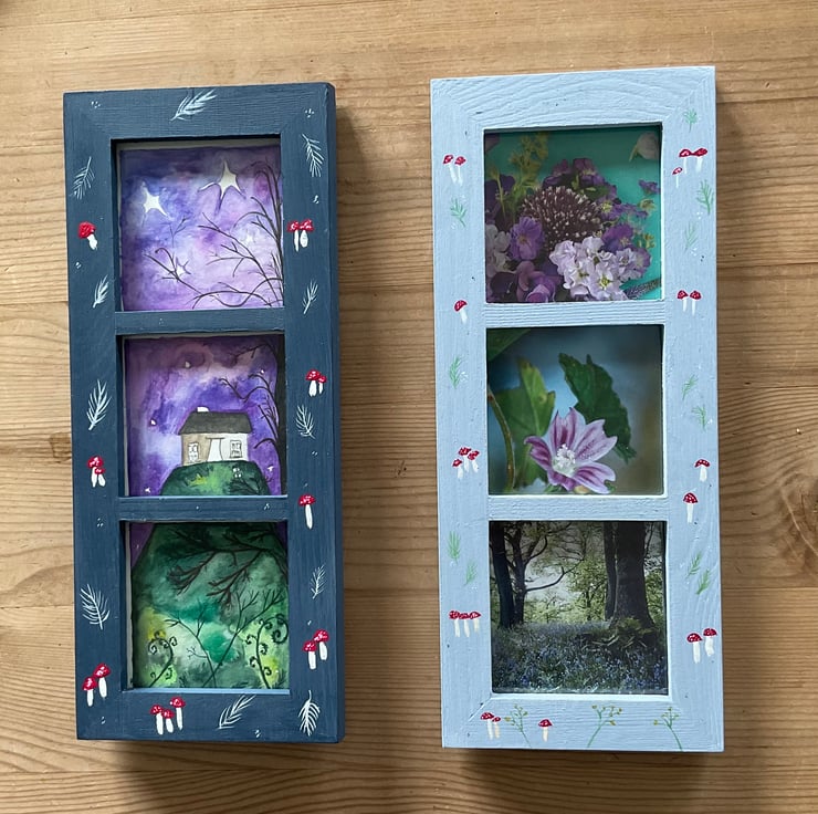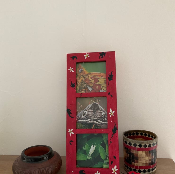 These 3 window, free standing picture frames are painted in Farrow and Ball and Annie Sloane paints and decorated with hand-painted motifs. The frames measure 27cm x 11.5cm and the 3 apertures are 7cm x 7cm. The pane is made from glass and the frame is 100% wood and carries the FSC mark.