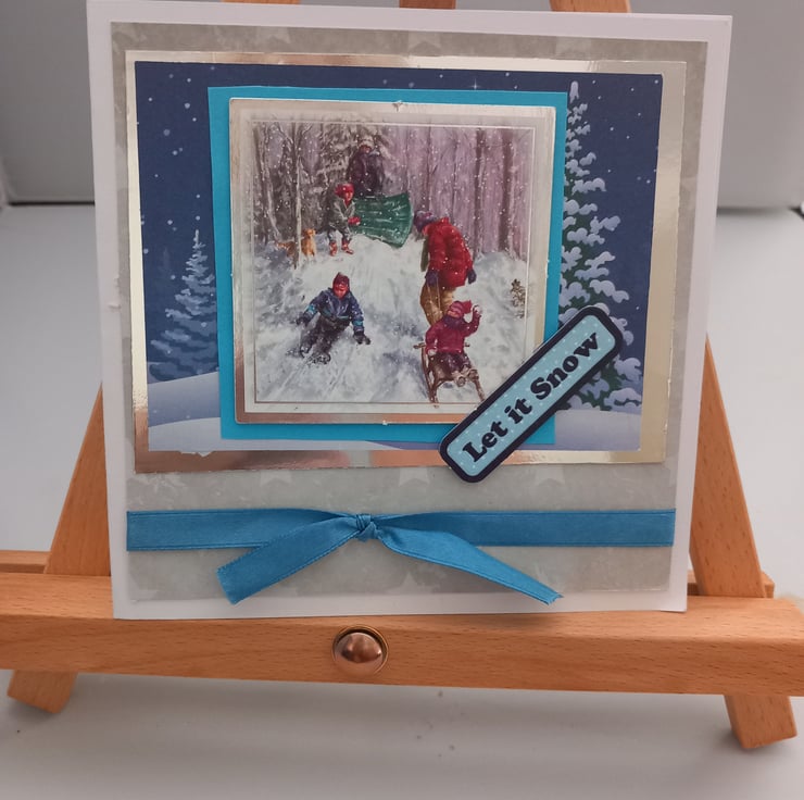 Card 3- silver mirror card layeeed with Christmas tree patterned card and a winter scene topper. The words 'let it smow' complete the design together with blue ribbon.