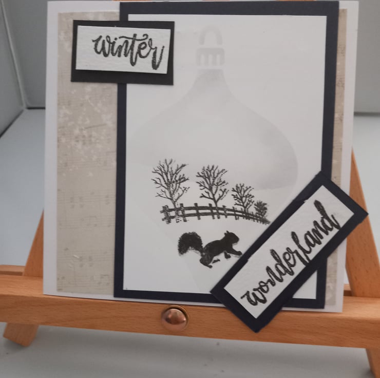 Card 1- a winter scene on whie card layered onto black. The scene has been hand stamped usong a stamp by cardi-o stamps. The words 'winter wonderland' complete the design.