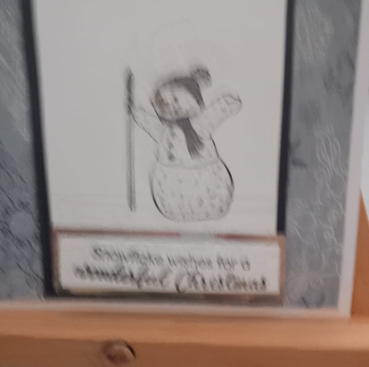Card 2 - A snowman is hand stamped, colored and glitter added for extra sparkle. The snowman is on white card layered on to black, the design is completed with the words ' snowflake wishes for a wonderful Christmas'.