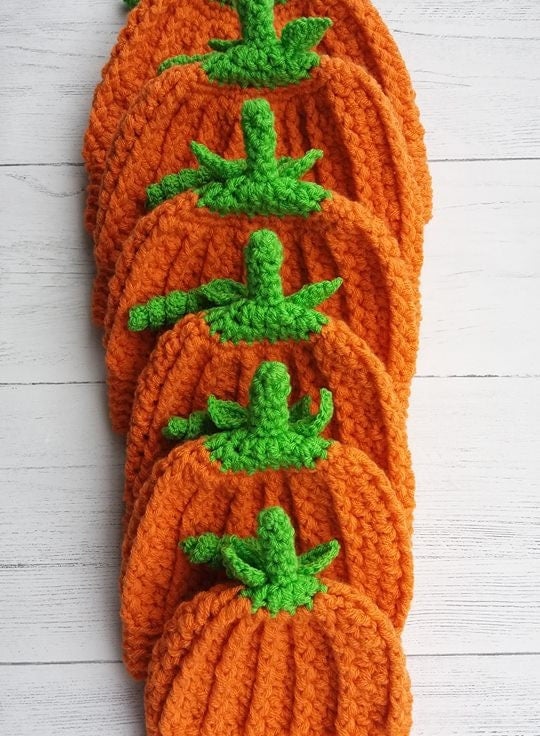 Suitable for the Halloween season, photo shoots, fancy dress, general winter wear. Hats are soft and stretchy. Each hat features built in stalk with stitched on leaves and curly strand.