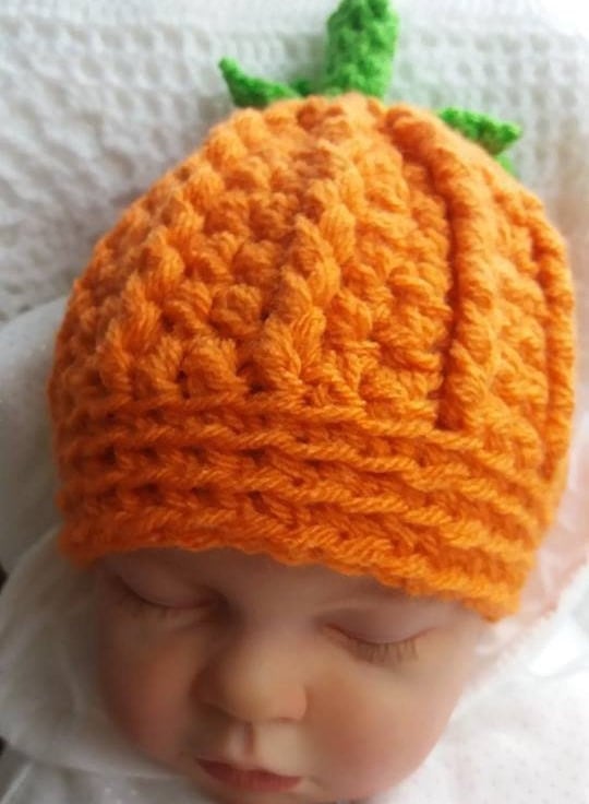 Hats are made in 100% soft acrylic burnt orange yarn with green contrast top.