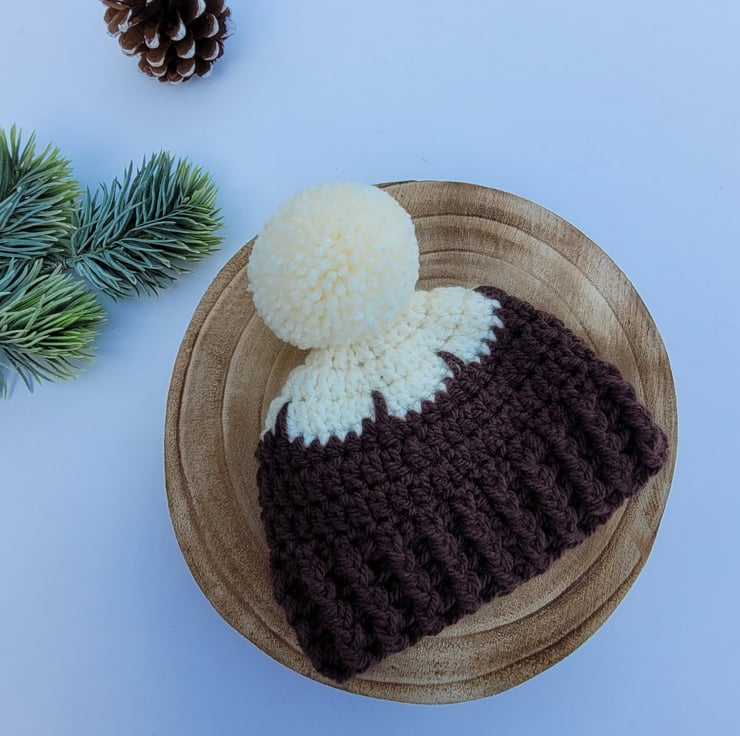 Main body of hat is cream and brown with a nice deep rib and handmade cream pompom.