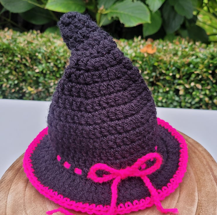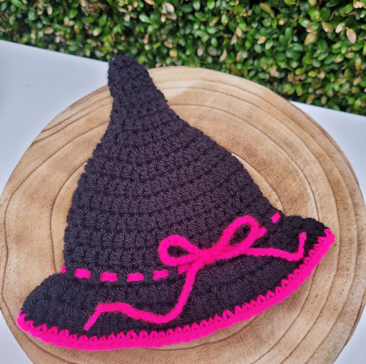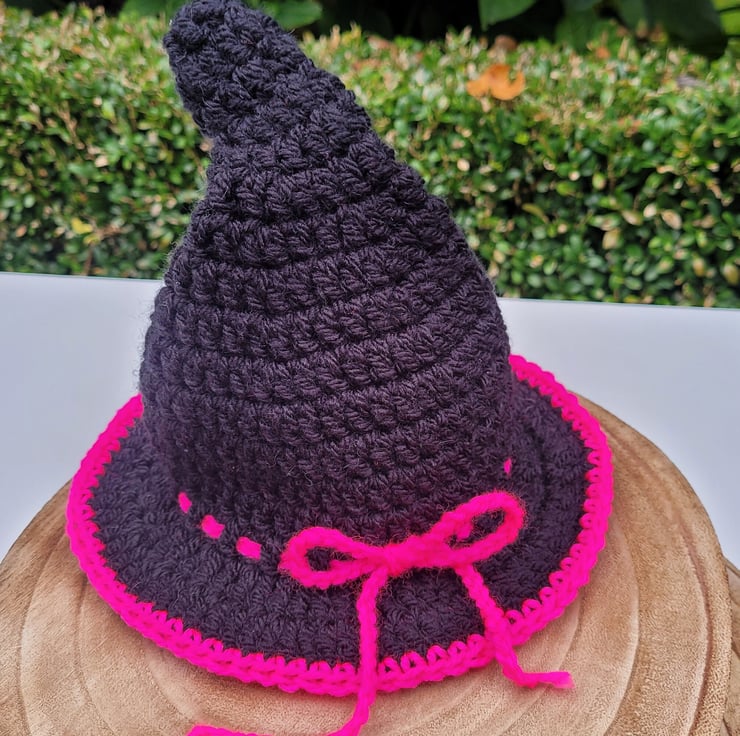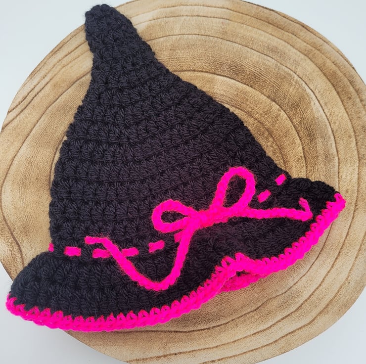 Hat is finished with a handmade cord threaded through and tied in a bow. This is a very pretty little witches hat and will make a good hat to photo baby in over the Halloween period.