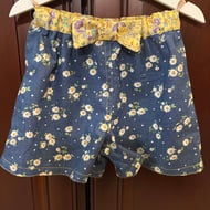 Dolls shorts and cropped top. This outfit is made to fit 18”/46cm dolls. The shorts pull on. They have two decorative flower shape buttons at the front and a soft pattern in the fabric. The top a lined cropped style in a white tropical print.