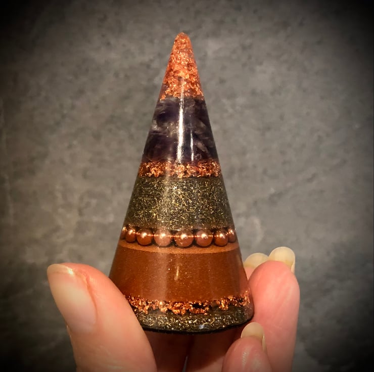 Orgonite (Orgone energy) is similar to what the ancients called prana, chi or universal energy. Orgonites are created by layering organic and inorganic materials that are able to harness this vital life force energy and amplify it. Some say you can actually feel a sensation with it. Quartz and other crystals are locked into the matrix and amplify the state of their own frequency. Orgonites are a combination of resin, various metals and crystals which create a high frequency output and a negative-frequency filter all in one piece. When Orgonite is within range of a source of negative energy (like electromagnetic frequencies - EMFs), it will efficiently and continuously transform it into positive energy.
