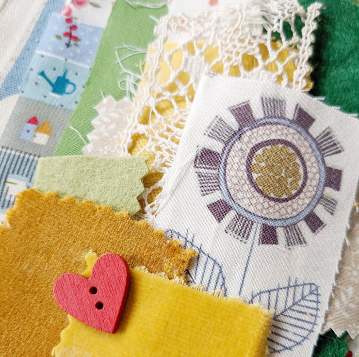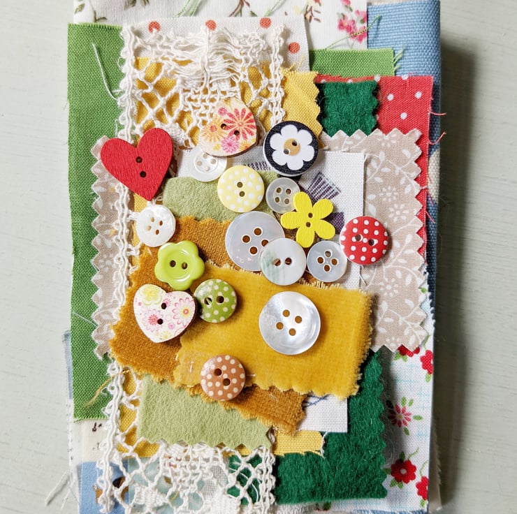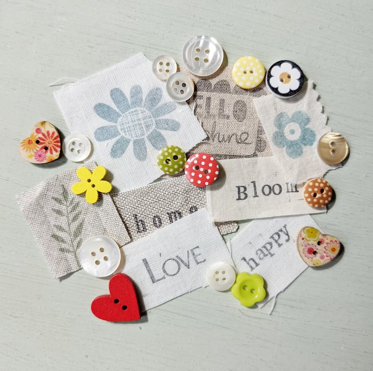 A collection of mixed fabric pieces with trims, buttons and hand stamped snippets and words.