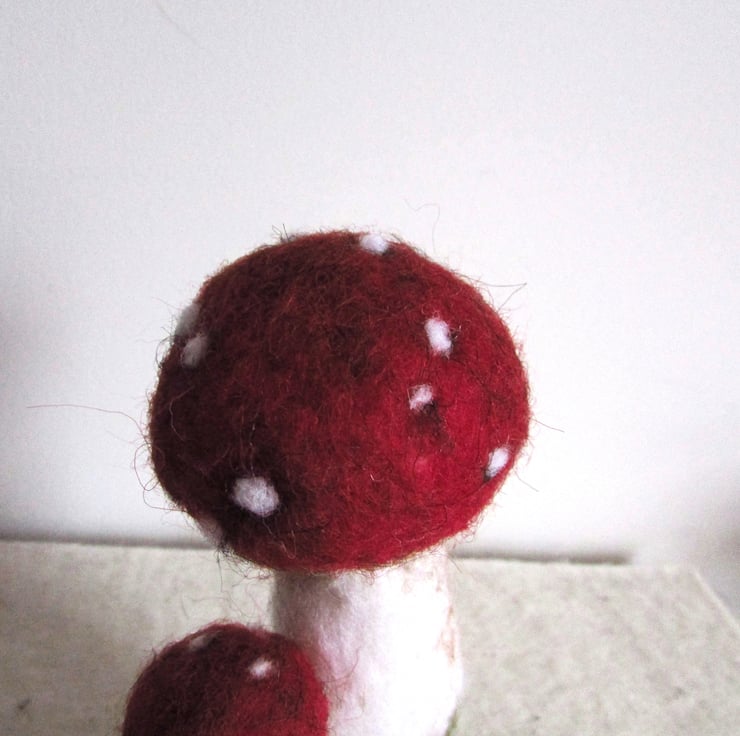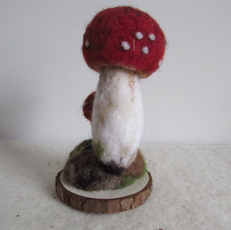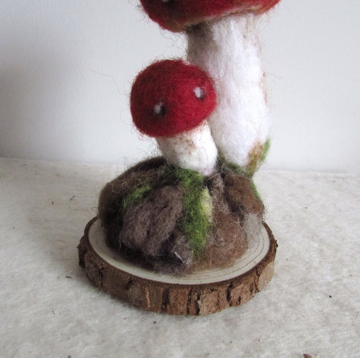 Needle Felted fungi display with two fly agaric fungi.