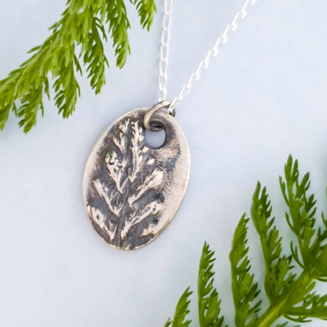 I start by using a leaf from a real yarrow plant to create a finely detailed mould, which I then use with silver clay to create a perfect impression of the leaf. The clay is then fired to create solid fine silver, before being polished to a high shine. I have oxidised it using liver of suphur to create a dark patina on the surface and polished the high points back to a beautiful shine, creating a lovely contrast that highlights the shape and fine details of the leaf.