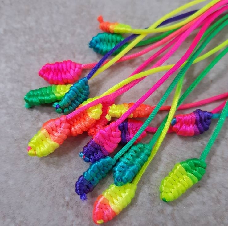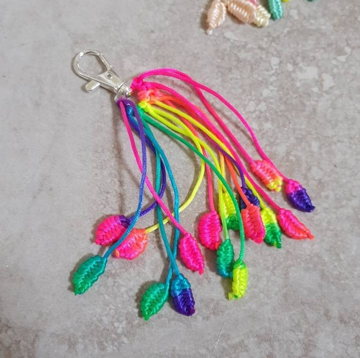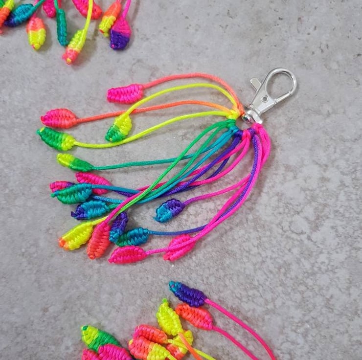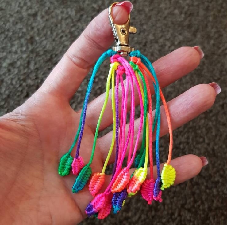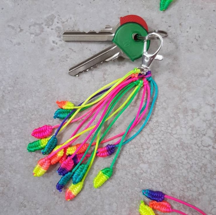 A cute key or bag charm, it is hand knotted on silky neon rattail cord. All individually braided so patterns will vary.