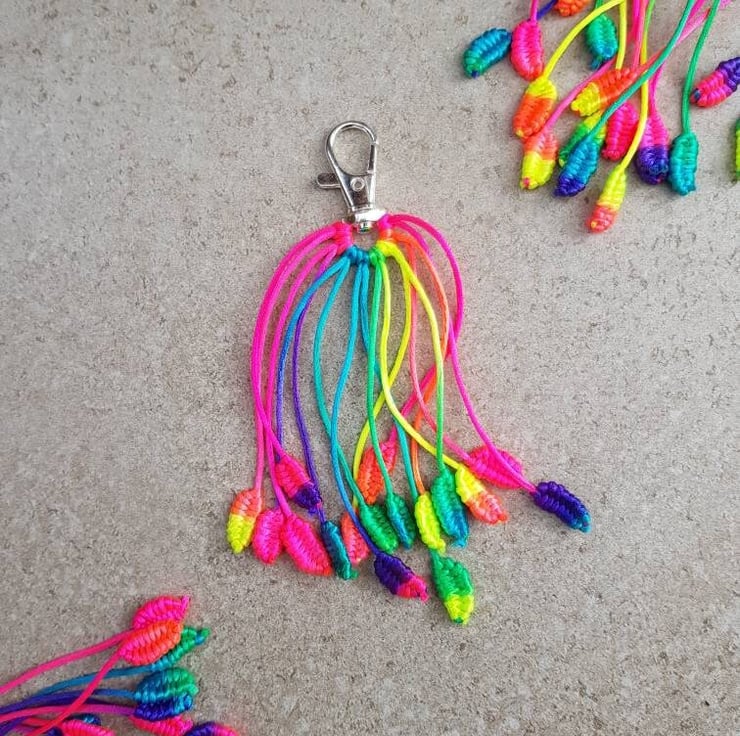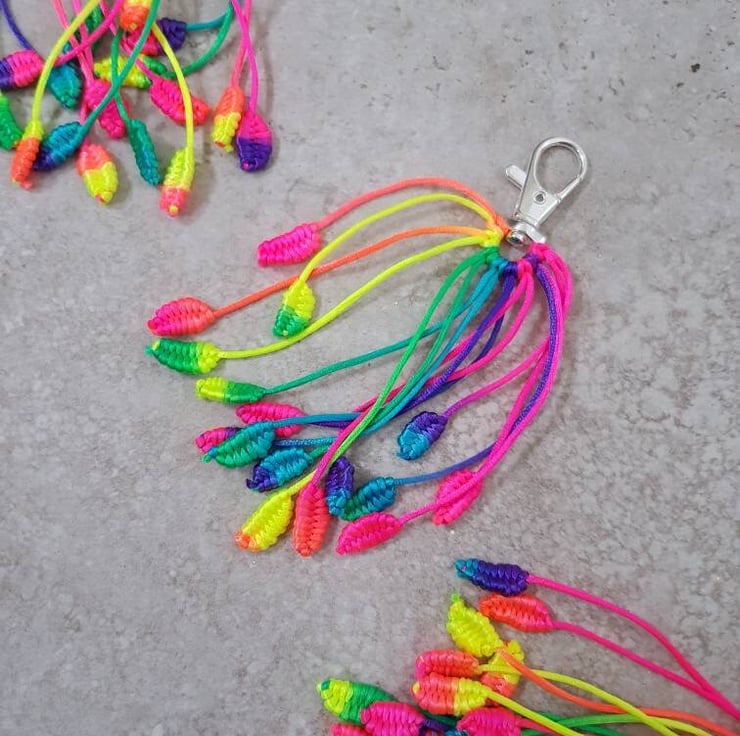 A cute key or bag charm, it is hand knotted on silky neon rattail cord. All individually braided so patterns will vary.