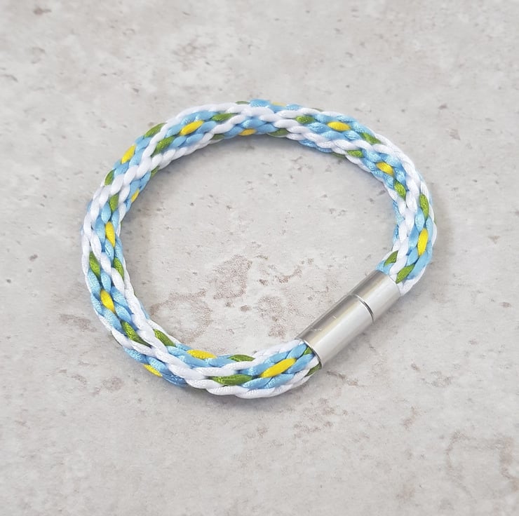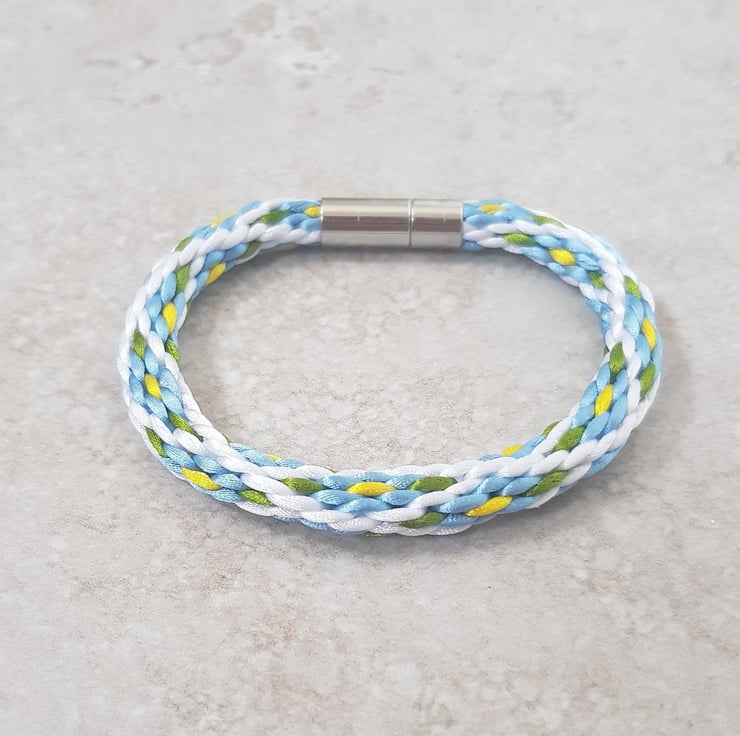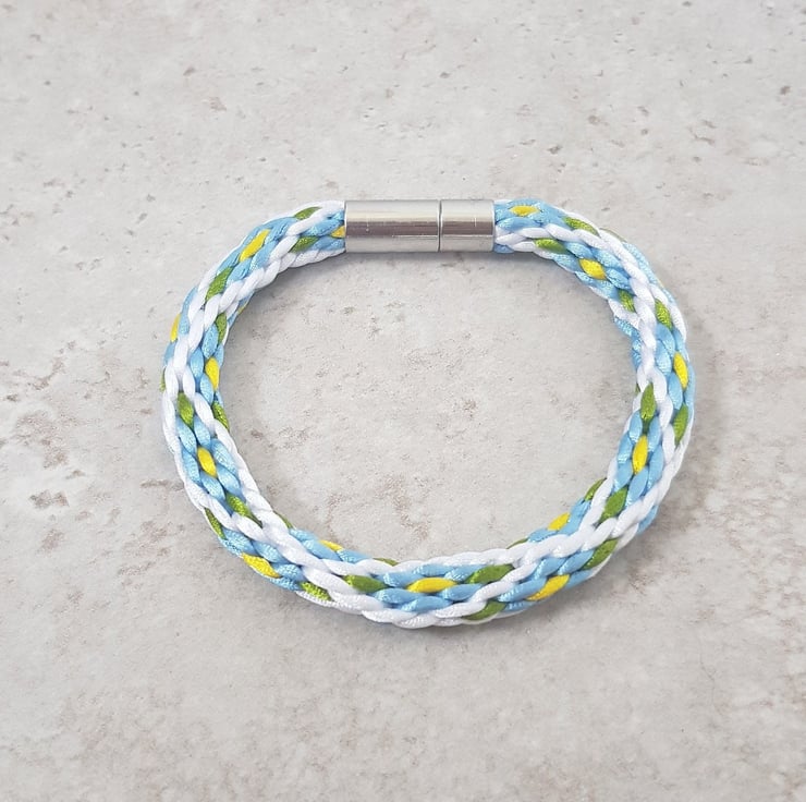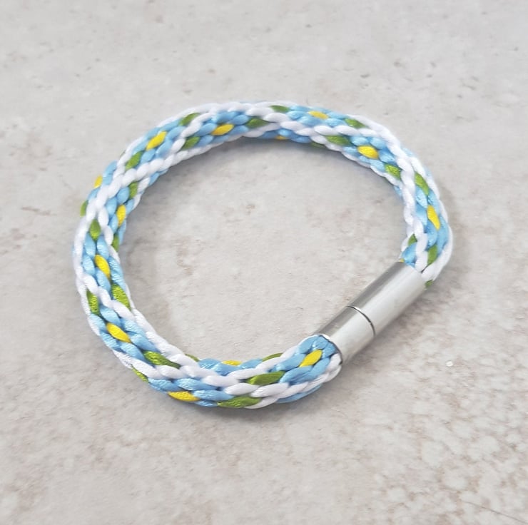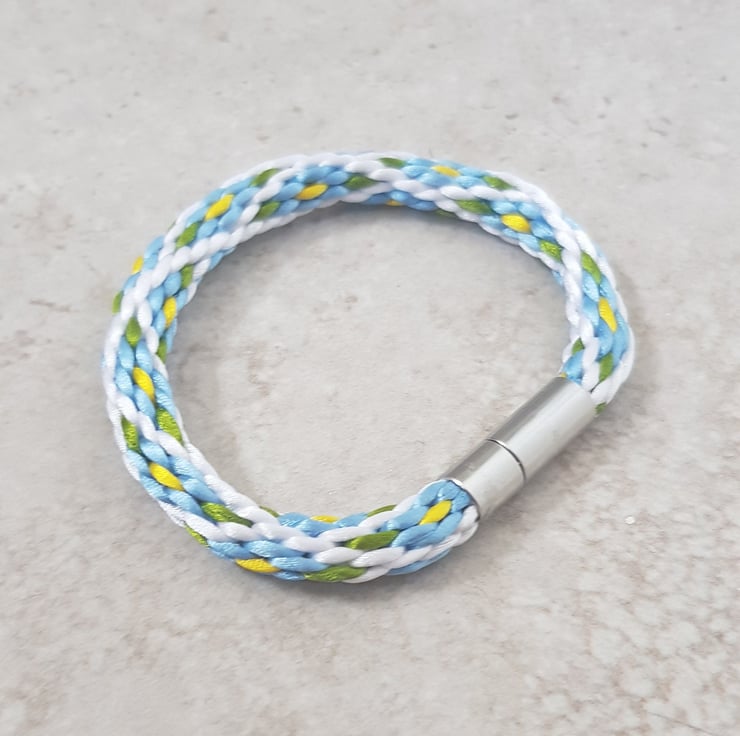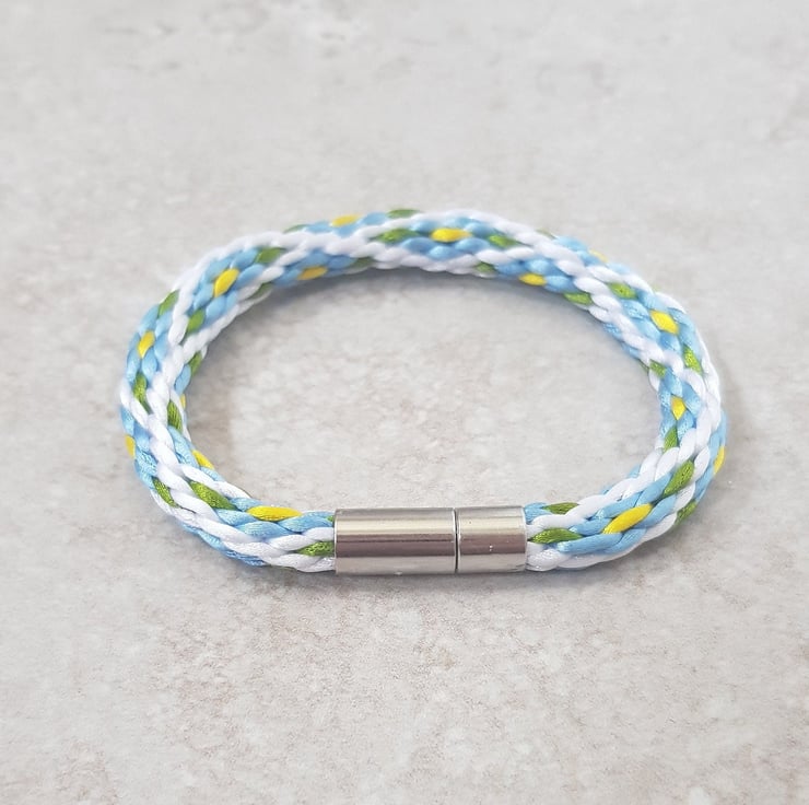 This pretty bracelet in a cute blue and white flower pattern is handwoven with soft rattail silk cord and finished with a silver tone bayonet clasp.