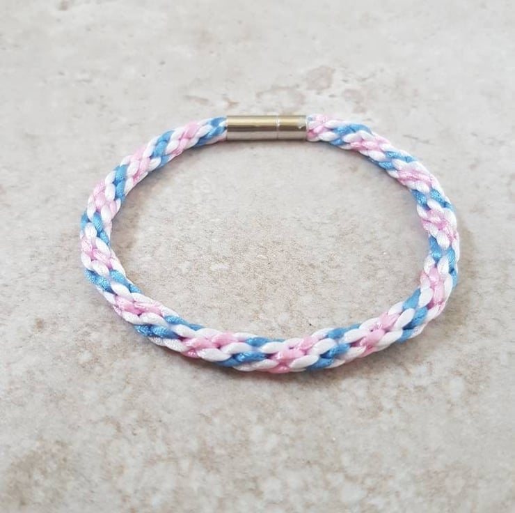 This listing is for ONE blue, pink and white bracelet with bayonet clasp.