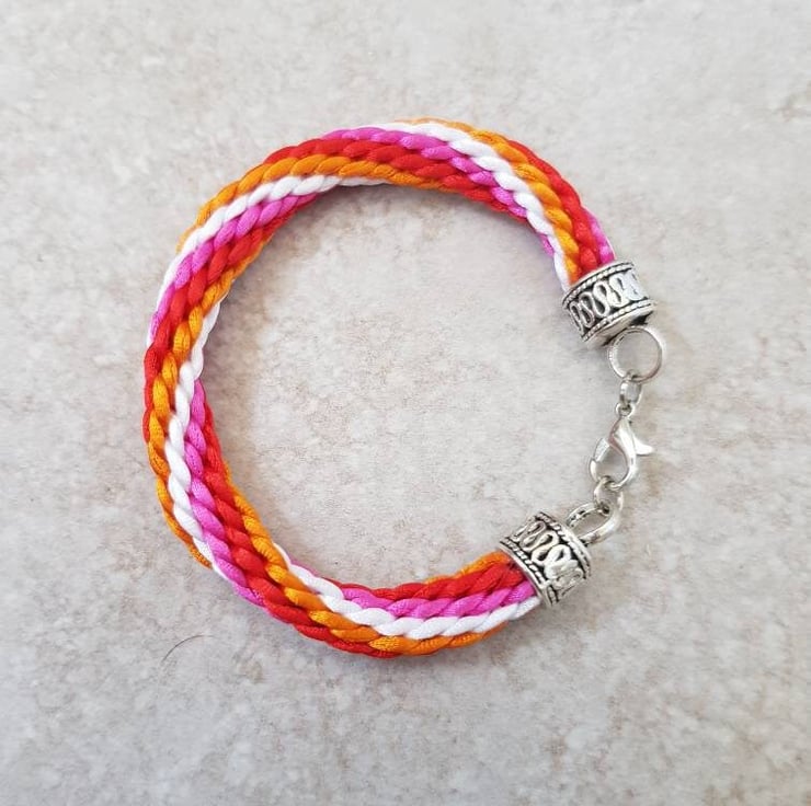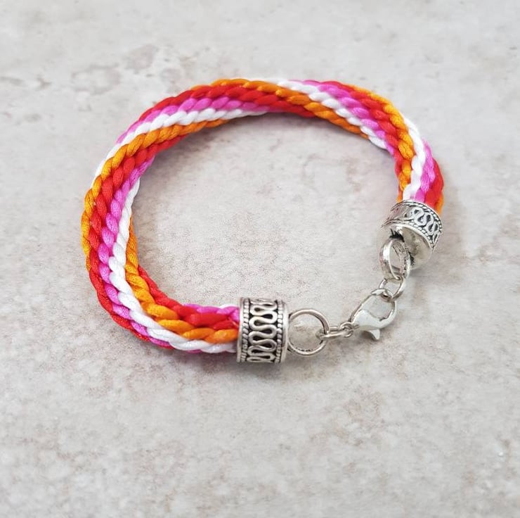 This colourful bracelet is hand woven in a pink, red, orange and white spiral stripe pattern, with strands of silky rattail cord and finished with a silver coloured Tibetan style lobster clasp.