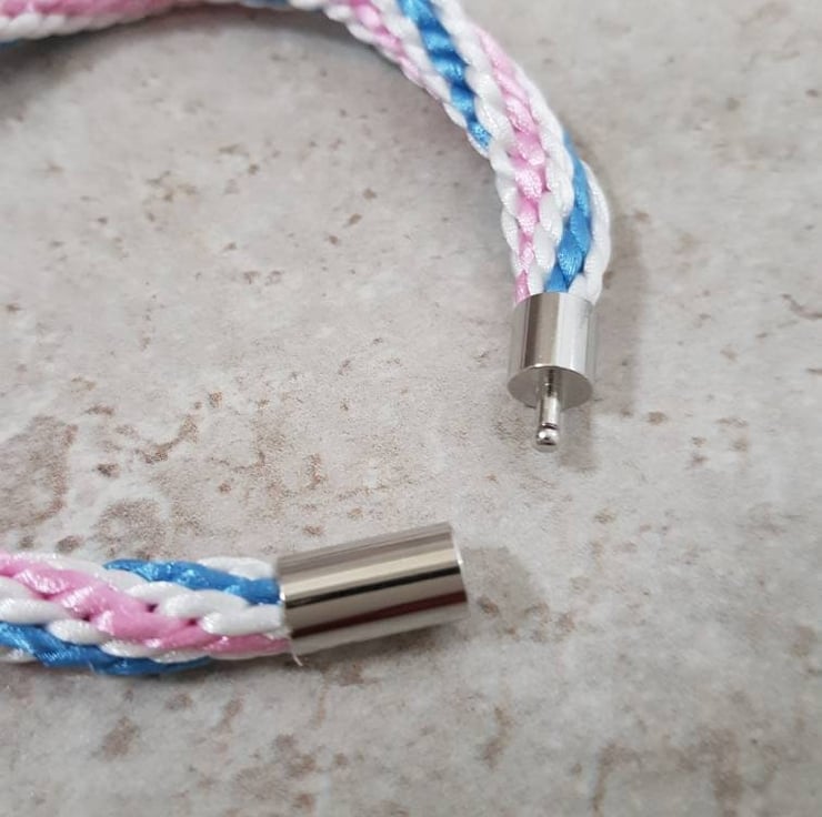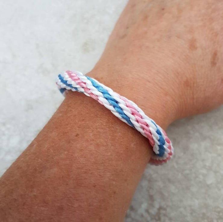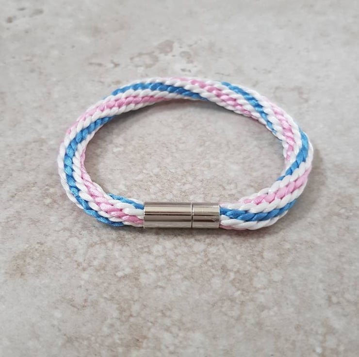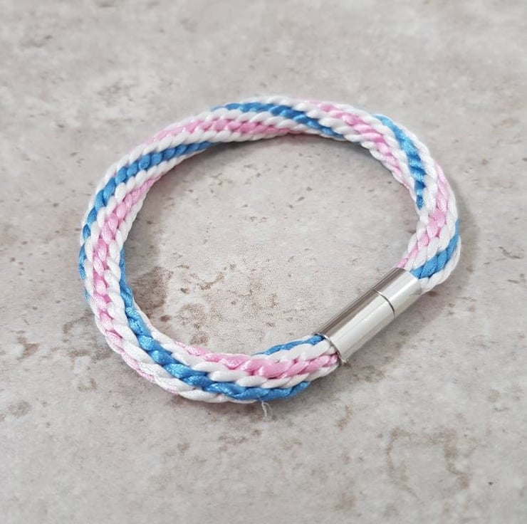 This handbraided Bracelet is woven in a pink, blue and white stripe pattern, with 16 strands of silky satin cord and finished with a strong bayonet magnetic clasp. Wear your bracelet with Pride!