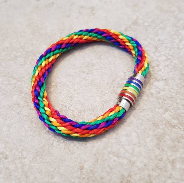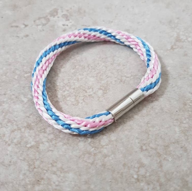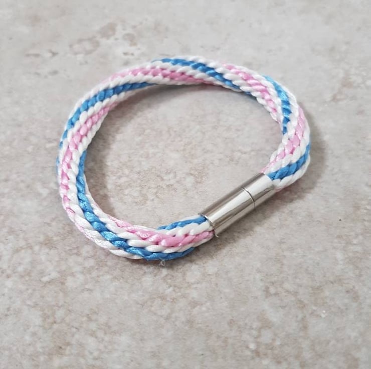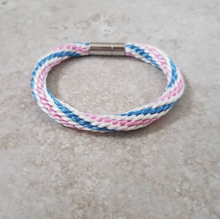 This handbraided Bracelet is woven in a pink, blue and white stripe pattern, with 16 strands of silky satin cord and finished with a strong bayonet magnetic clasp. Wear your bracelet with Pride!