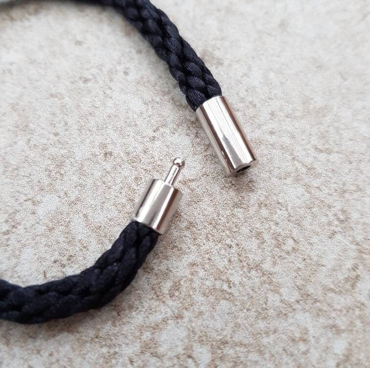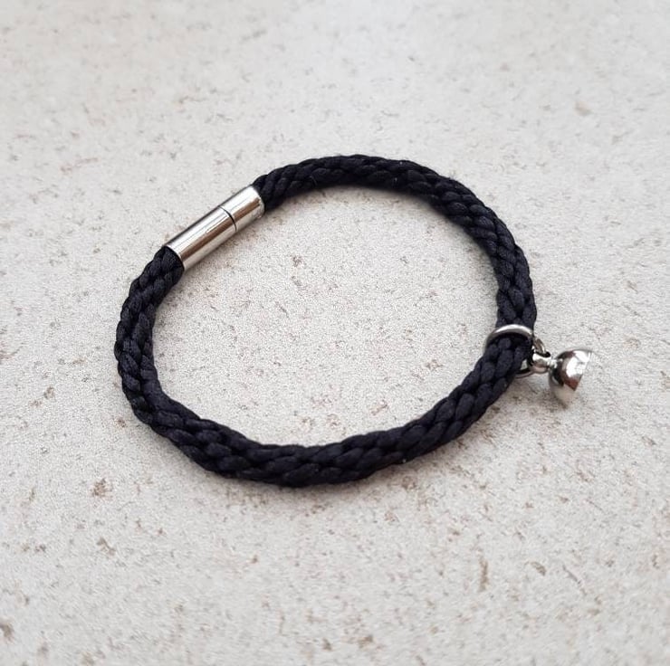 Hand braided with satin cord and finished with a secure bayonet clasp. A magnetic charm completes it.