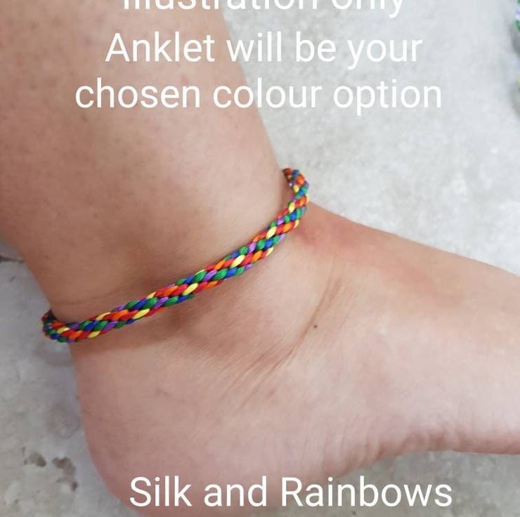 This hand braided bracelet or anklet is woven in 1mm rattail silk and finished with a secure bayonet clasp.