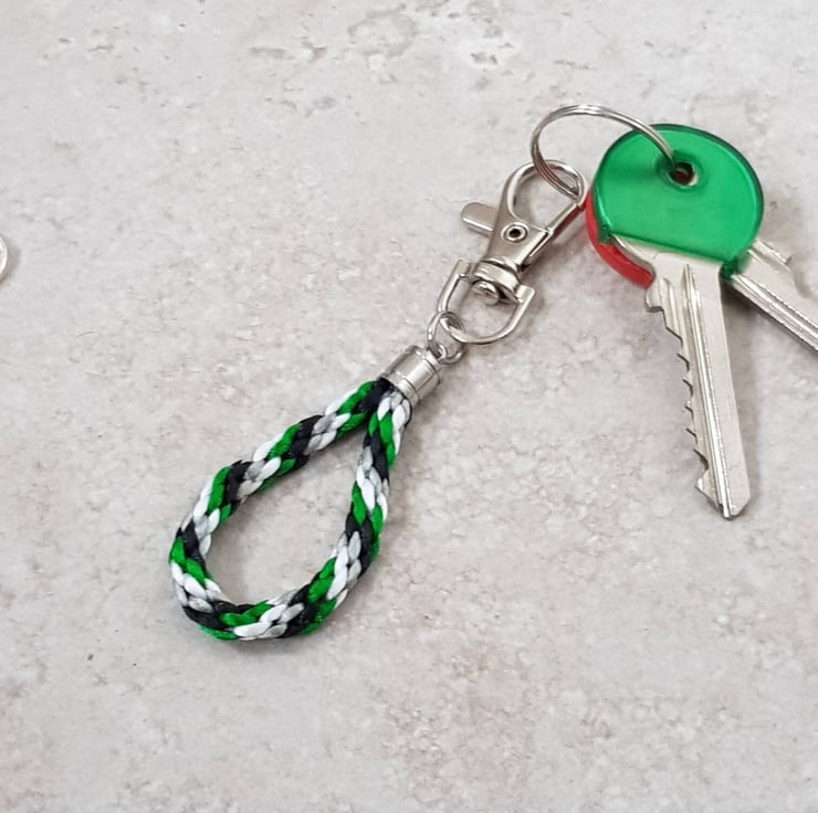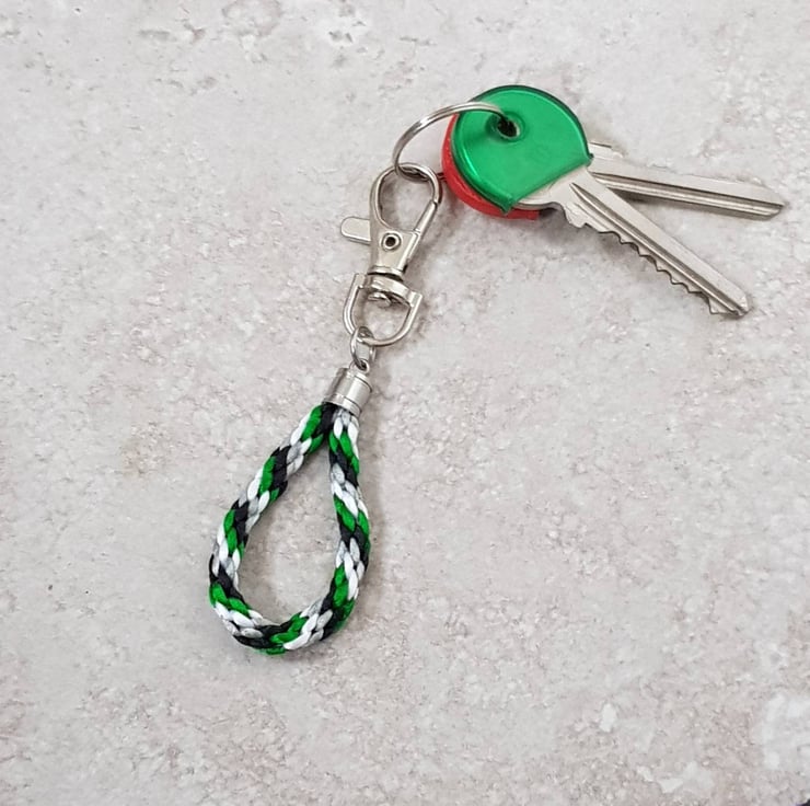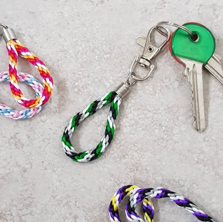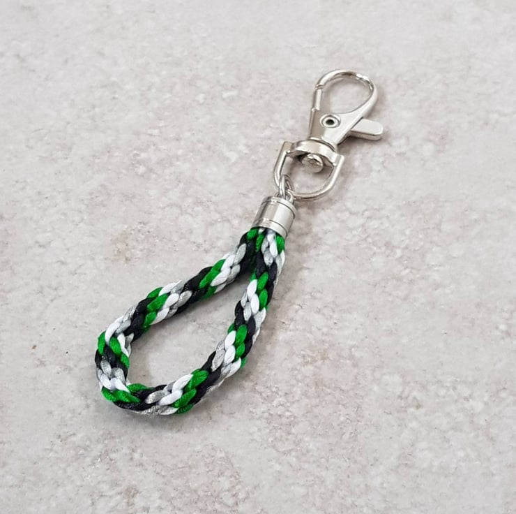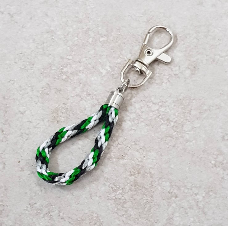 This cute Aro flag keyring or bag charm is handknotted silky nylon satin cord attached to a silver tone clip.