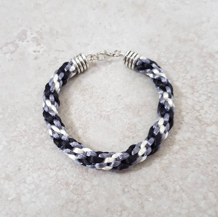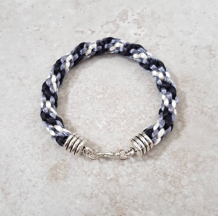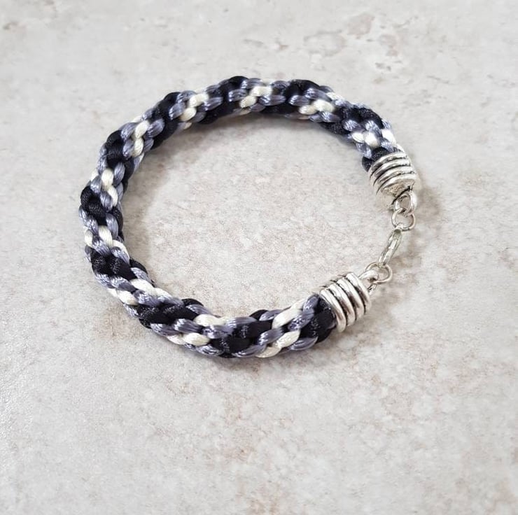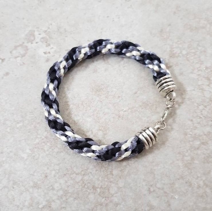 All bracelets are handwoven with 8 strands of rattail silk cord and finished with a silver toned lobster clasp.