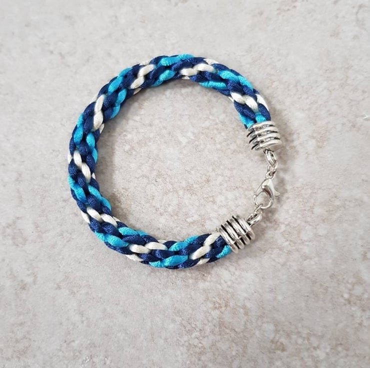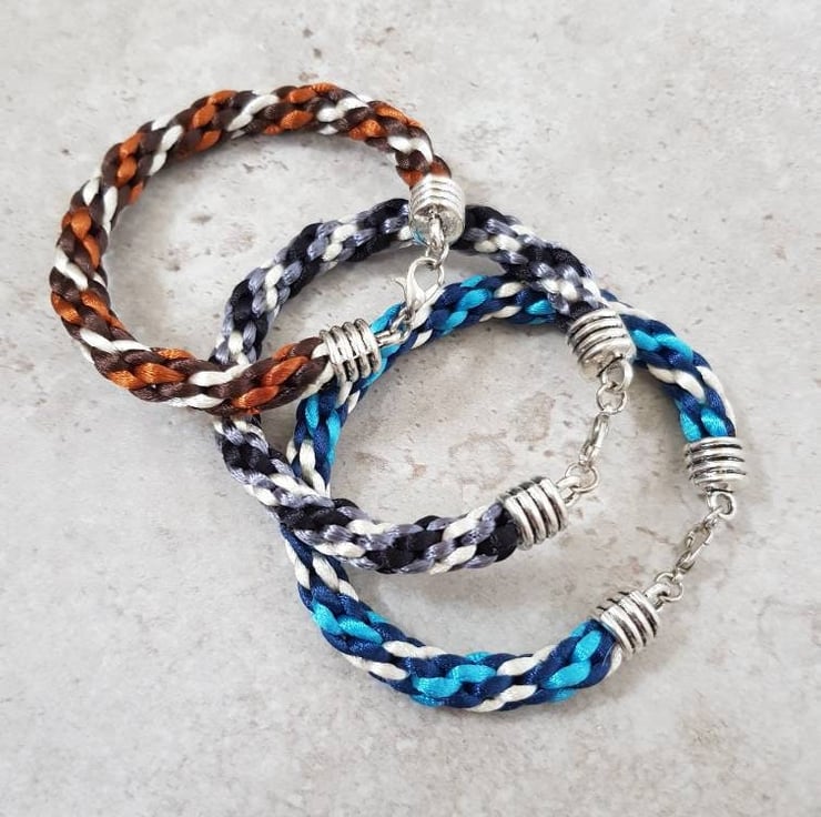 All bracelets are handwoven with 8 strands of rattail silk cord and finished with a silver toned lobster clasp.