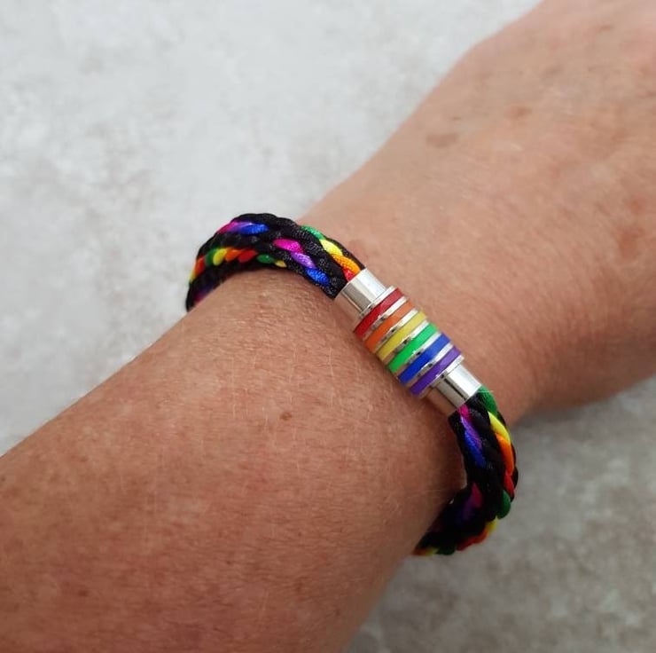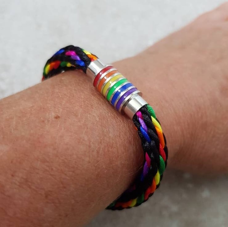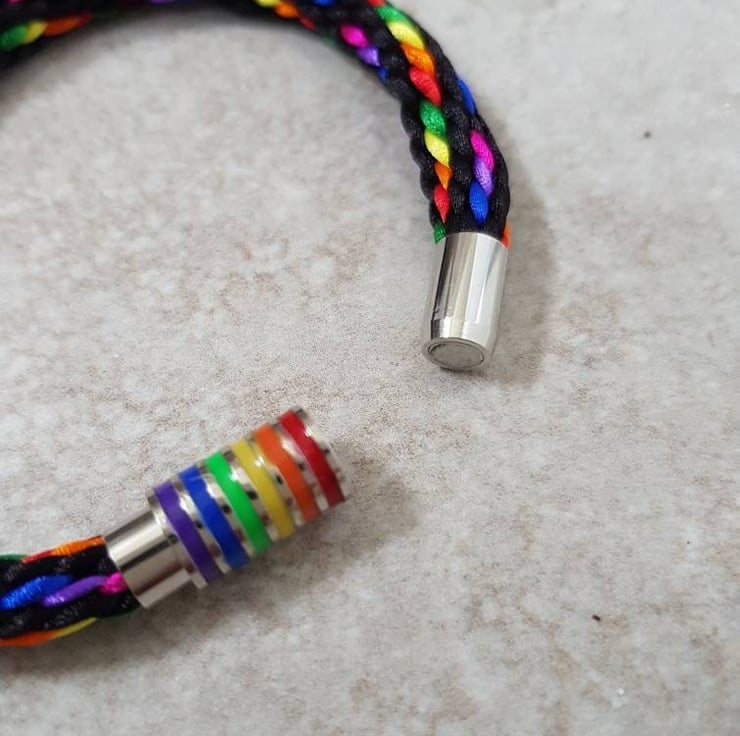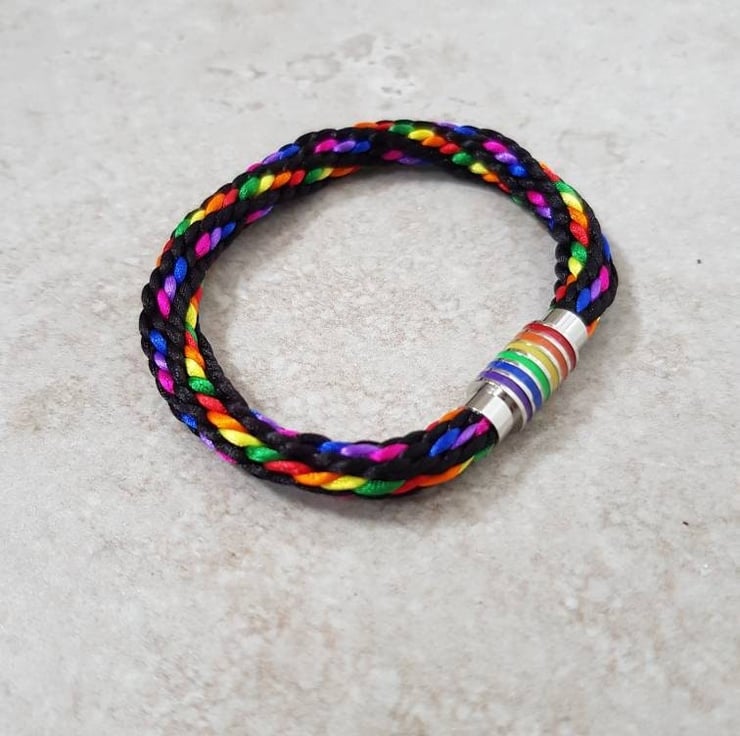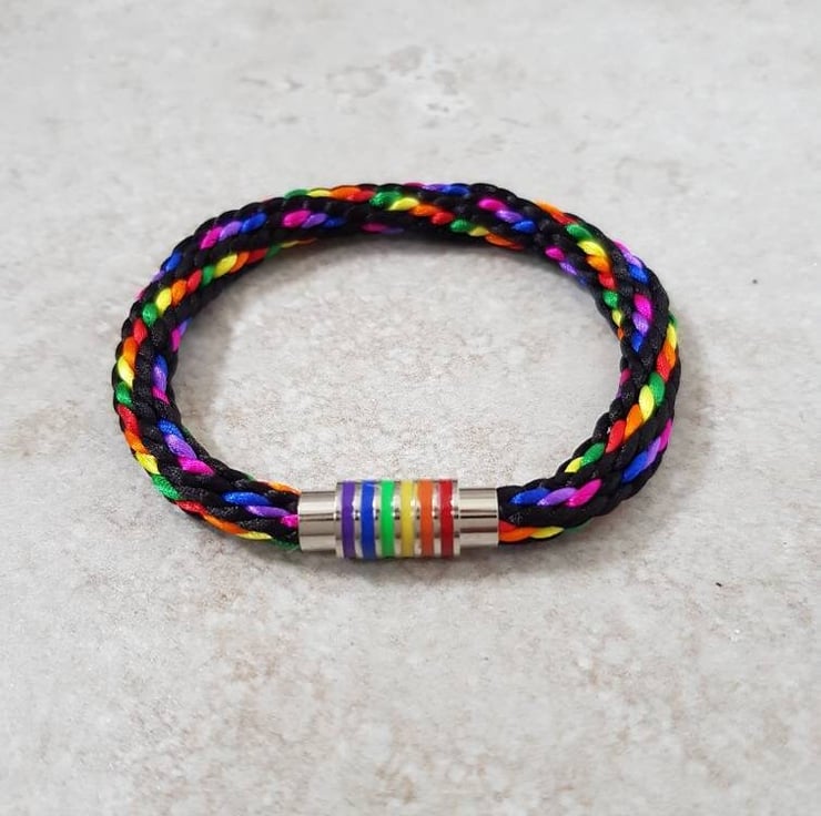 Rainbow lovers! Festival Goers! Colour Addicts! This stunning Black Rainbow Bracelet is handwoven with rattail silk cord and finished with a rainbow striped magnetic clasp.