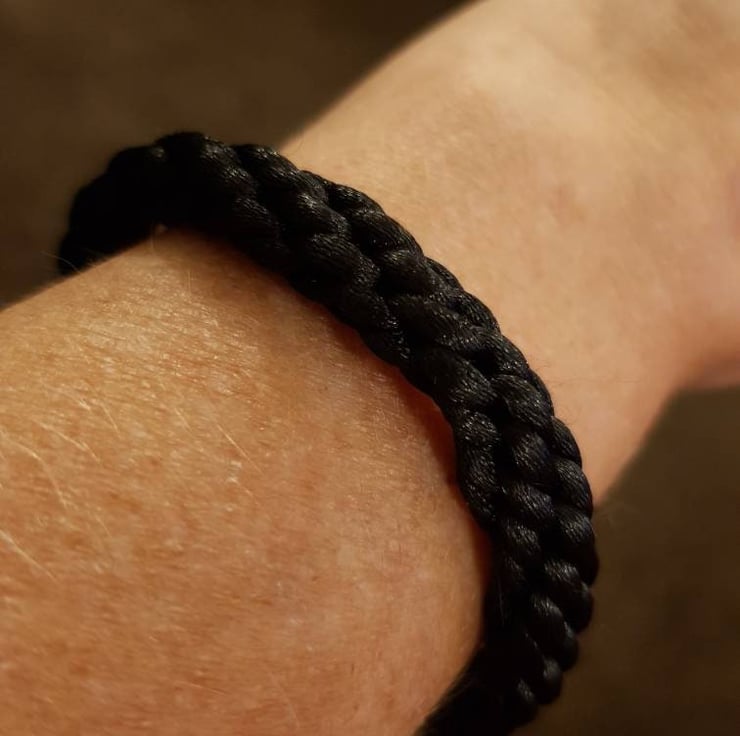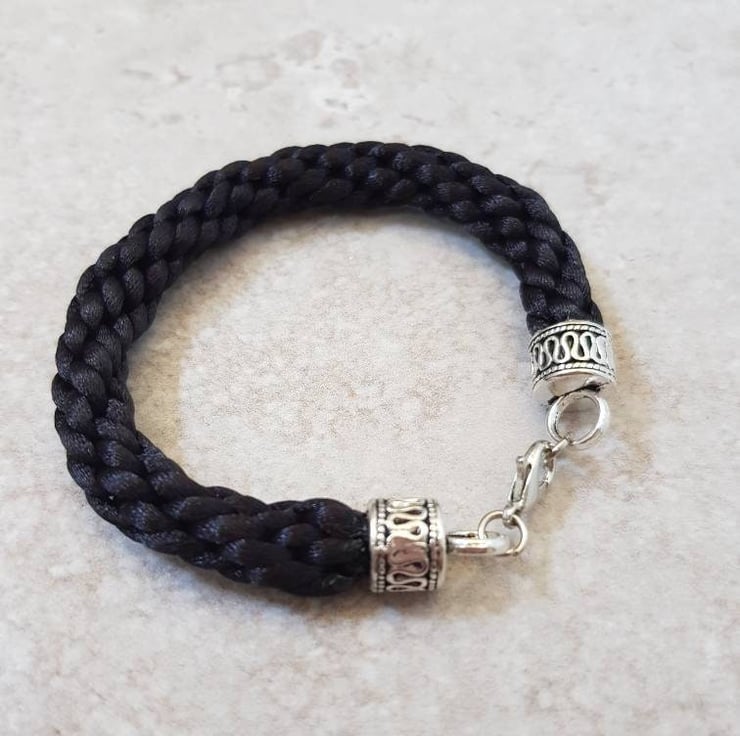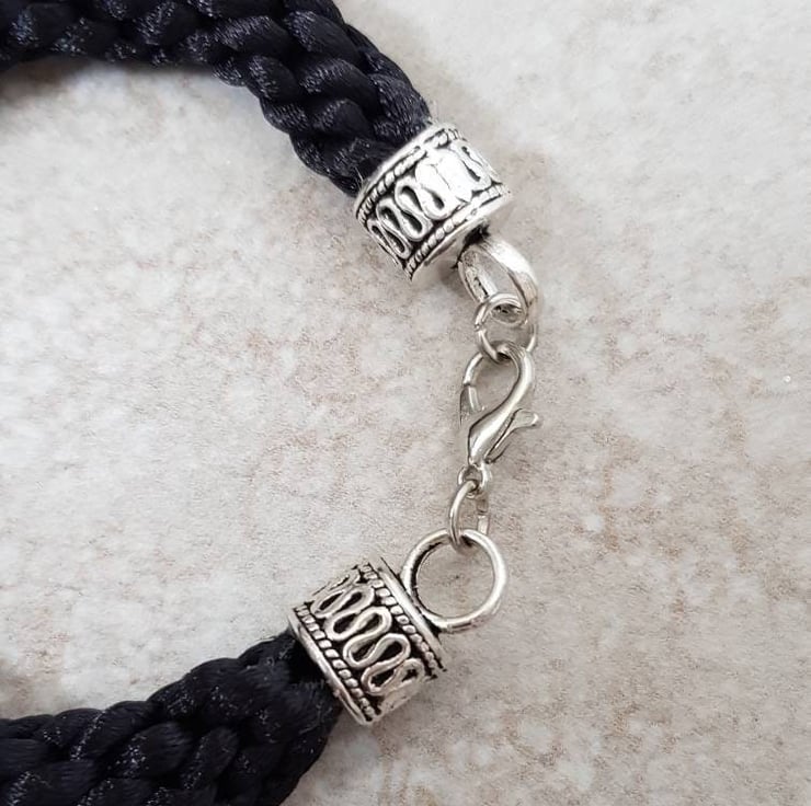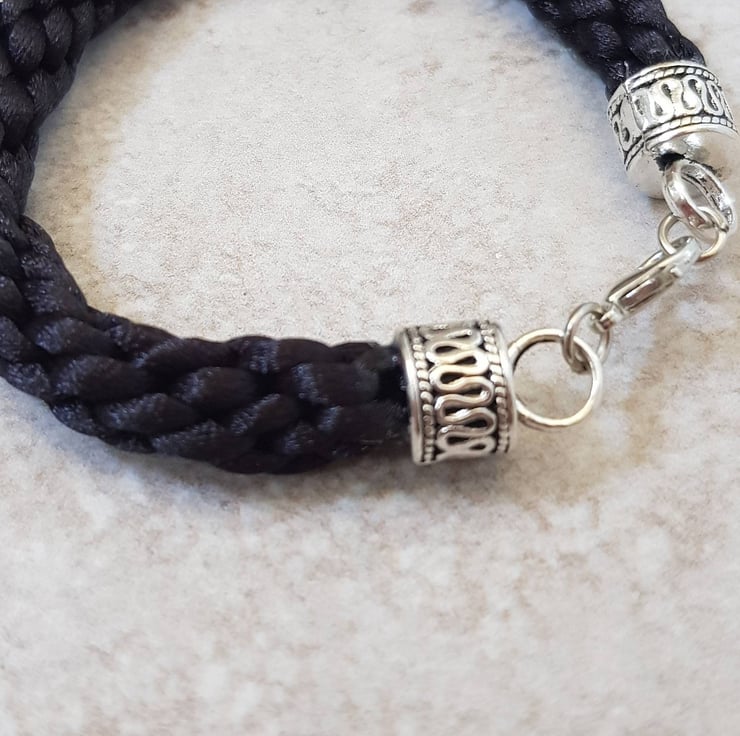 Plain and simple but stylish too. This minimalist braid is perfect for both men and women, all day, every day. Handwoven with chunky black rattail silk cord and finished with a Tibetan silver lobster clasp.