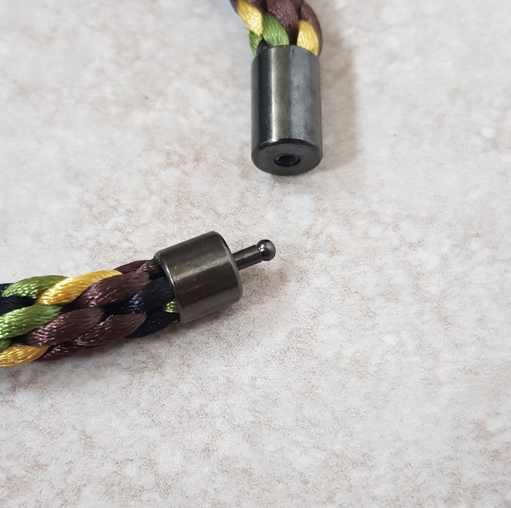 In khaki, chocolate, gold and black, handwoven with 8 strands of rattail silk cord and finished with a gunmetal coloured bayonet clasp.