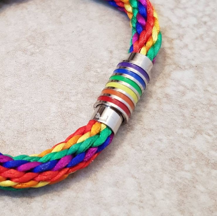 Rainbow lovers! Festival Goers! Colour Addicts! This colourful Rainbow Bracelet is Handwoven in a rainbow stripe pattern with 16 strands of colourful 1mm rattail silk and finished with a rainbow striped silver coloured magnetic clasp.